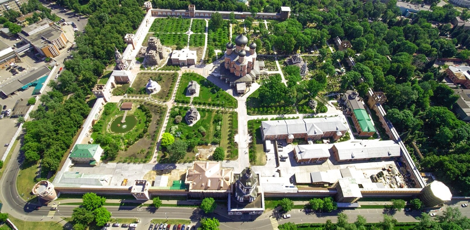 Архитектурный ансамбль обители, формировавшийся на протяжении XVI—XVIII веков, представляет собой выдающийся памятник церковного зодчества. На снимке можно видеть мощные стены и башни монастырской ограды, возведённые в стиле «нарышкинского барокко», которые придают обители вид древней крепости. За стенами возносятся к небу золотые купола храмов, сияющие на солнце. Центром композиции является монументальный Большой собор Донской иконы Божией Матери, построенный на средства царевны Екатерины Алексеевны, дочери царя Алексея Михайловича.