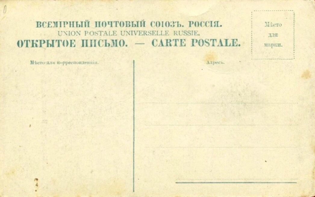 На лицевой стороне открытого письма, согласно принятым в то время установлениям Всемирного почтового союза, размещены надписи на двух языках: русском, с использованием дореформенной орфографии, и французском. Указаны наименования: «ВСЕМІРНЫЙ ПОЧТОВЫЙ СОЮЗЪ. РОССІЯ.» / «UNION POSTALE UNIVERSELLE. RUSSIE.», а также род корреспонденции: «ОТКРЫТОЕ ПИСЬМО» / «CARTE POSTALE». Чётко обозначены поля для написания послания («Мѣсто для корреспонденціи»), адреса получателя («Адресъ») и места для наклейки почтовой марки («Мѣсто для марки»).