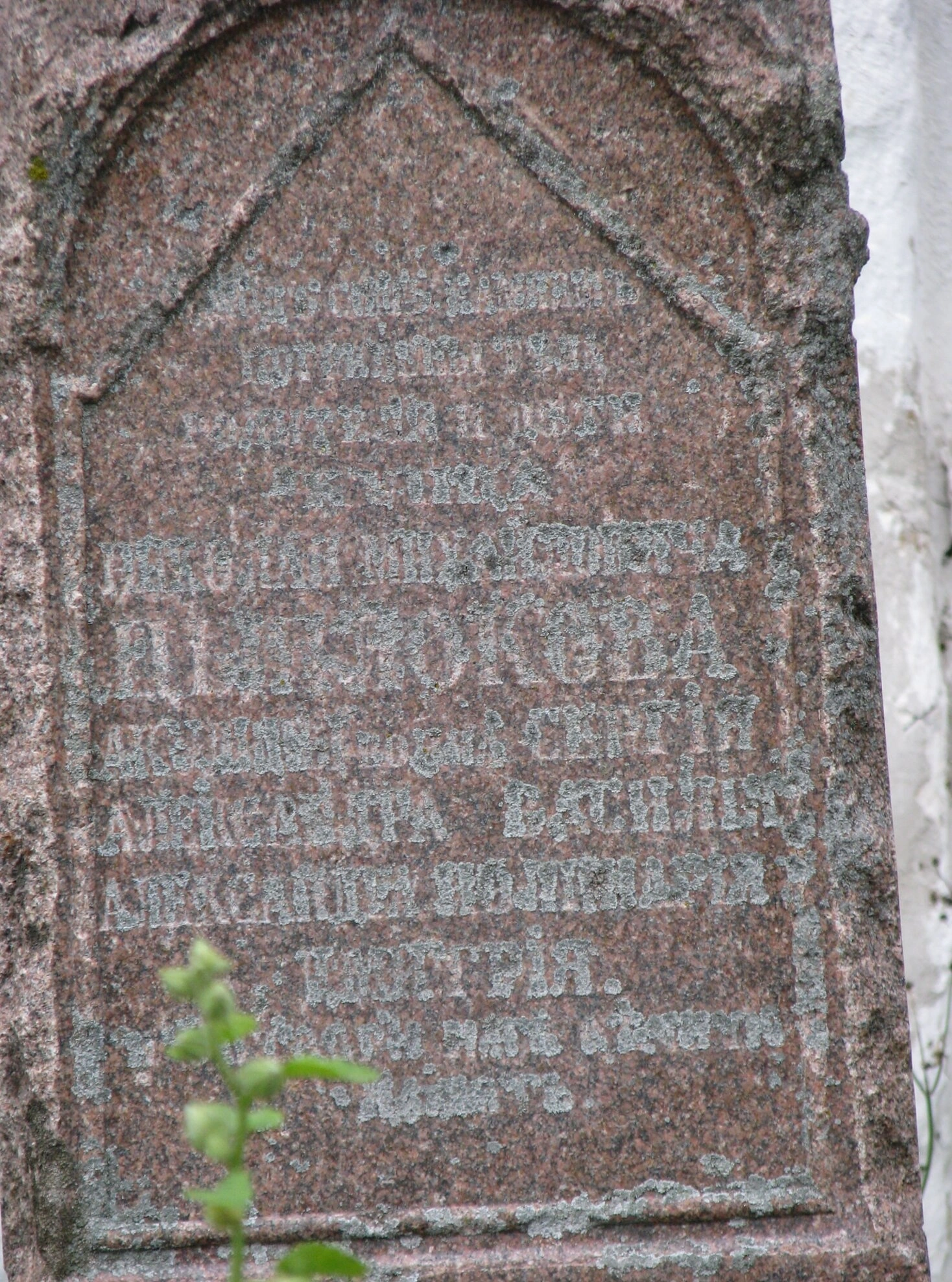 На представленной фотографии запечатлена старинная надгробная плита, выполненная из красного гранита, расположенная в исторической местности близ села Филісово Ивановской области. Географические координаты указывают на местонахождение данного артефакта в непосредственной близости от храма Введения во храм Пресвятой Богородицы, что позволяет отнести захоронение к числу исторических православных погребений на церковном погосте.