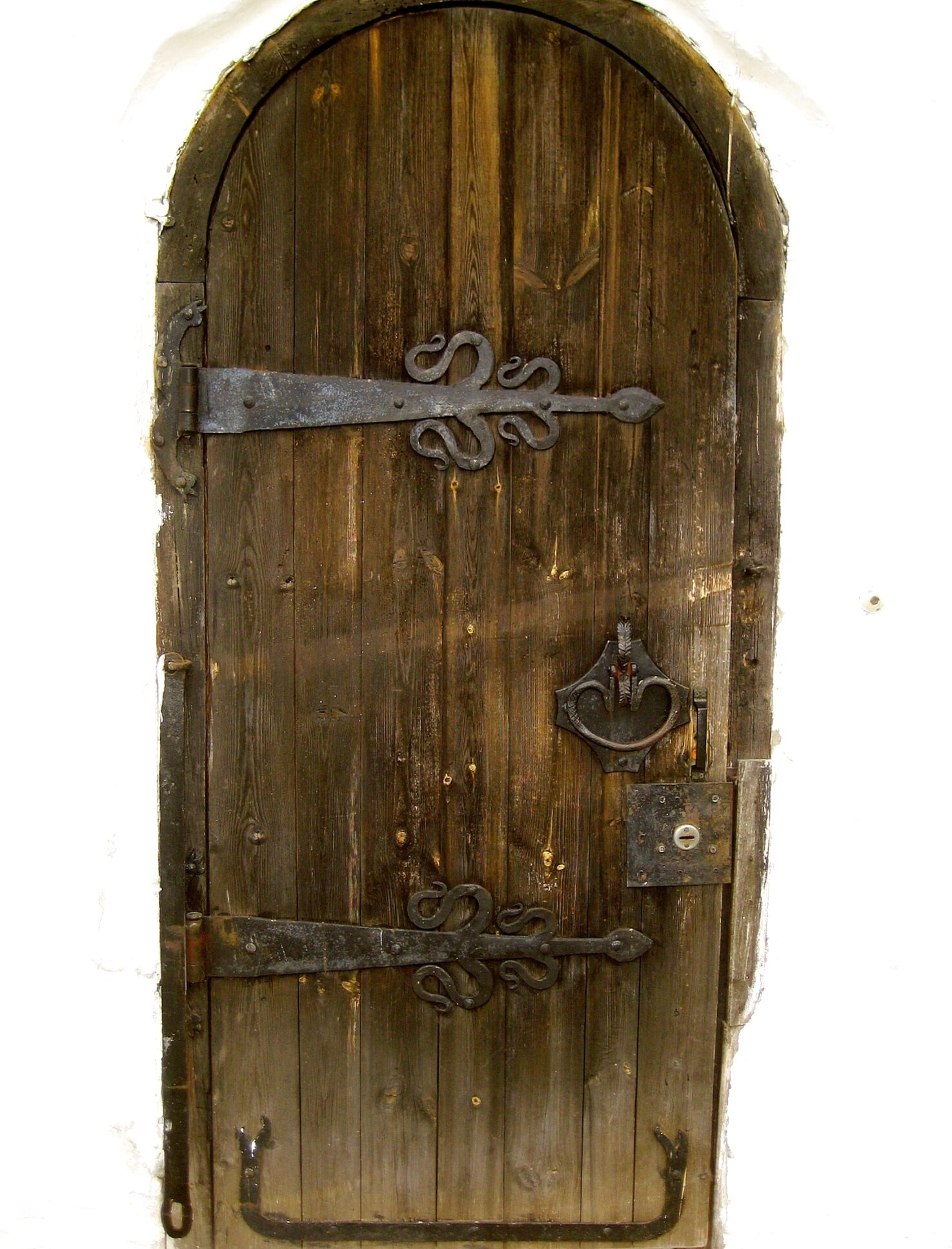 Дверь, выполненная в арочной форме из вертикальных деревянных досок, представляет собой выдающийся образец древнерусского craftsmanship. Массивные кованые петли и накладки, украшенные стилизованными узорами, не только выполняют утилитарную функцию, но и несут духовную символику, характерную для православной традиции. В центре композиции расположен кованый дверной молоток в виде кольца - древний стукало, которым паломники возвещали о своем приходе в дом Божий.