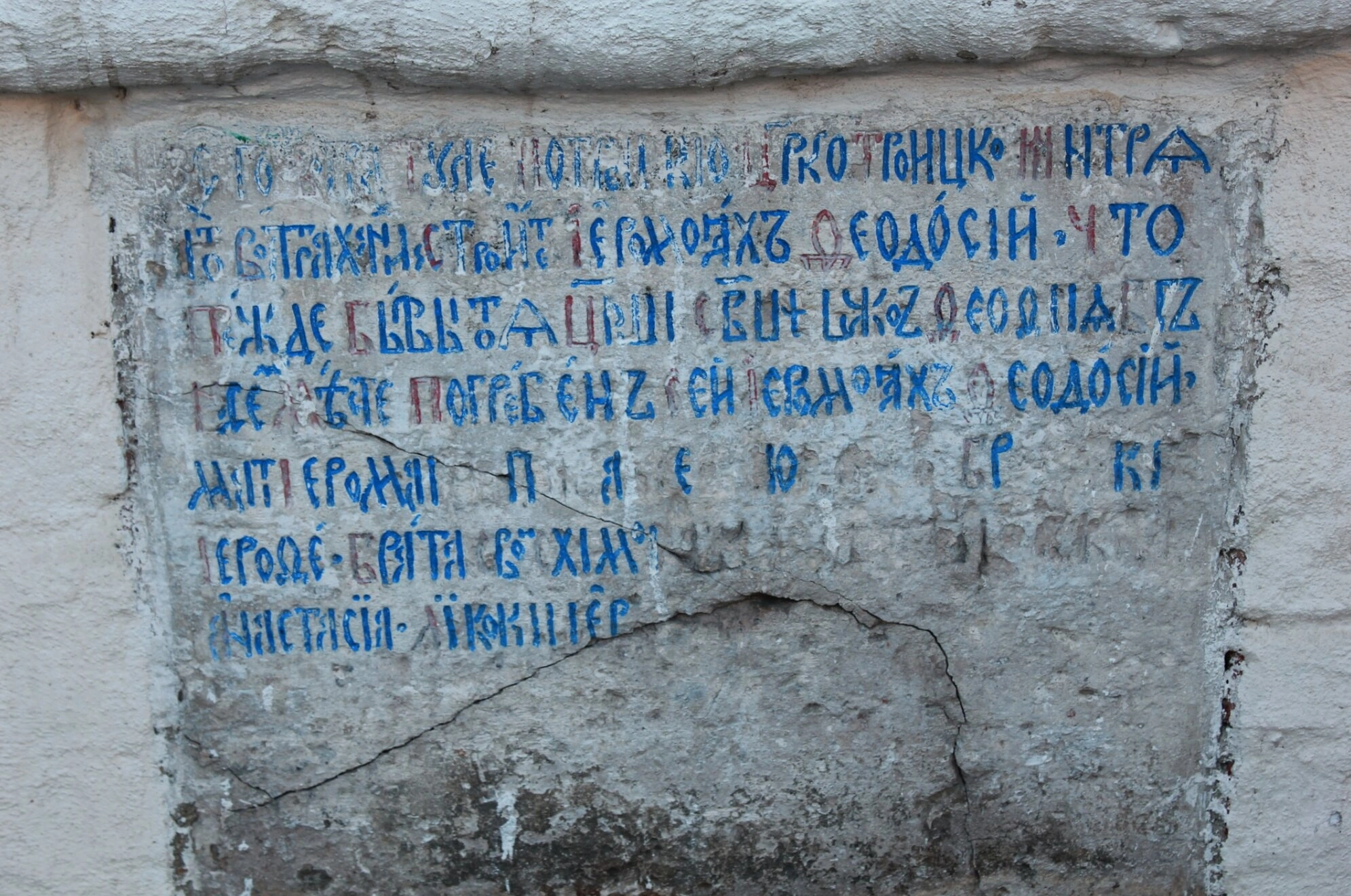 На представленной фотографии запечатлён уникальный исторический артефакт — каменная плита с фрагментами древней надписи, выполненной синей краской. Данный объект находится в стенах старинной Благовещенской церкви города Тулы, одного из древнейших каменных храмов города, известного с XVII столетия.