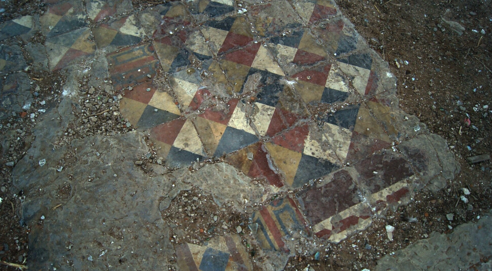 На представленной фотографии запечатлён уникальный артефакт — фрагмент напольной мозаики, обнаруженный в храме Покрова Пресвятой Богородицы, что расположен в селе Красная Река. Данный памятник древнего церковного искусства относится к числу редких образцов декоративного убранства православных храмов, выполненных в технике каменной мозаики.