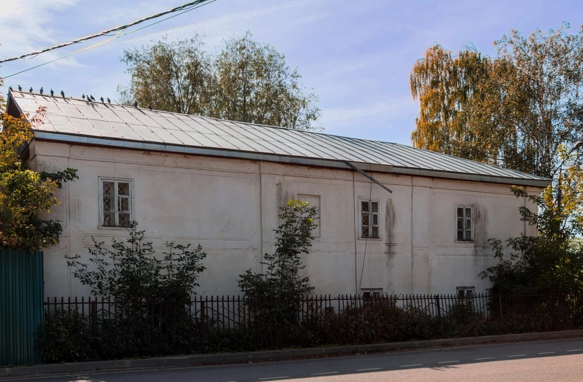 На представленной фотографии запечатлена Духовская церковь, являющаяся частью ансамбля Никольско-Пешношского мужского монастыря, расположенного в Дмитровском городском округе Московской области. Храм представляет собой одноэтажное здание, вытянутое вдоль монастырской дороги. Стены сооружения оштукатурены в светлых тонах, на отдельных участках заметны следы естественного износа штукатурного слоя, что придает строению особый исторический шарм.