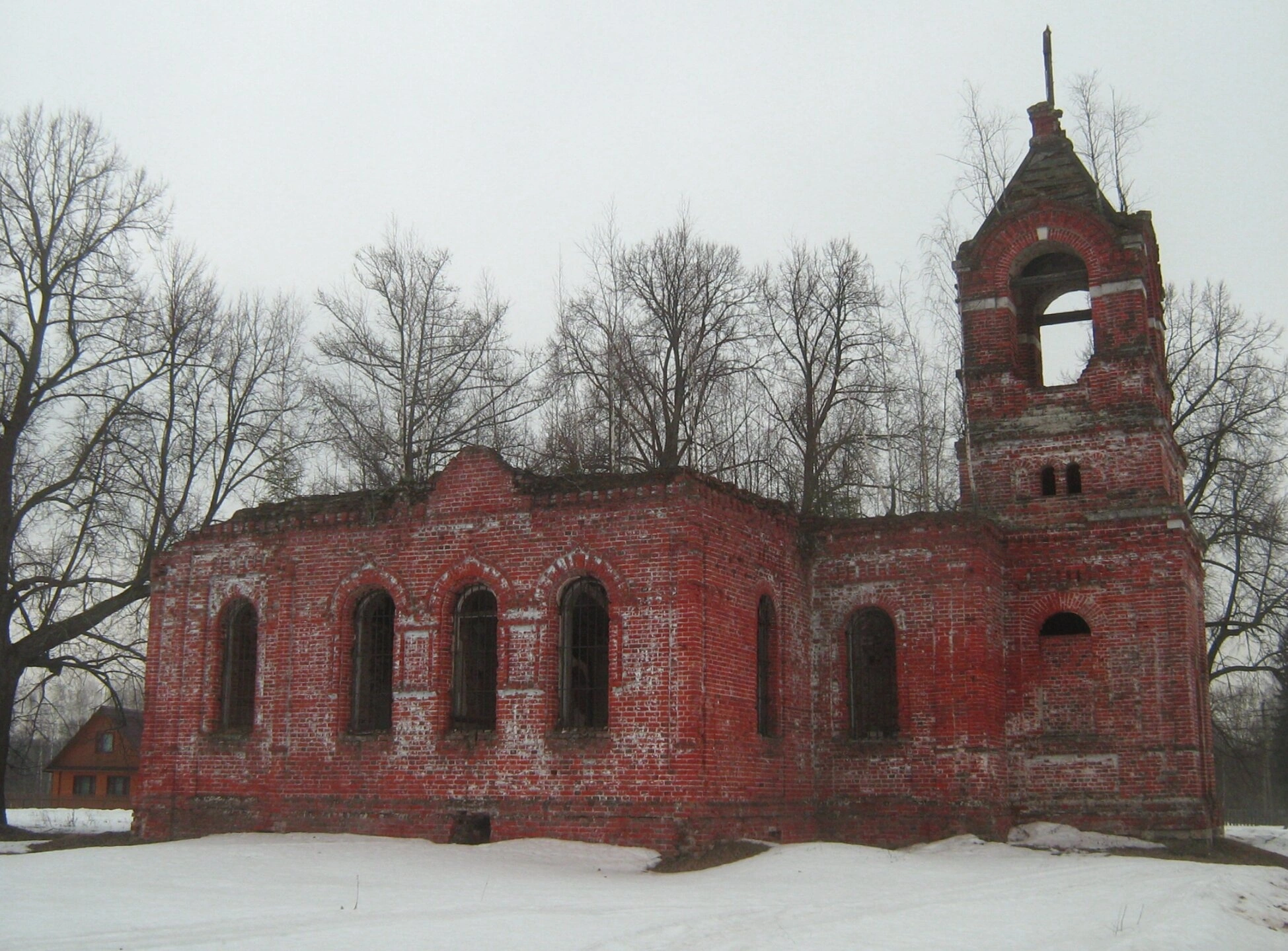 Кирпичное здание церкви, выполненное в традициях русского церковного зодчества, демонстрирует следы времени и разрушения. Несмотря на утрату былого величия, архитектурные формы храма сохраняют духовную значимость и историческую ценность. Пасмурное небо на фоне подчеркивает melanchоличное настроение снимка, напоминая о временности земного бытия.