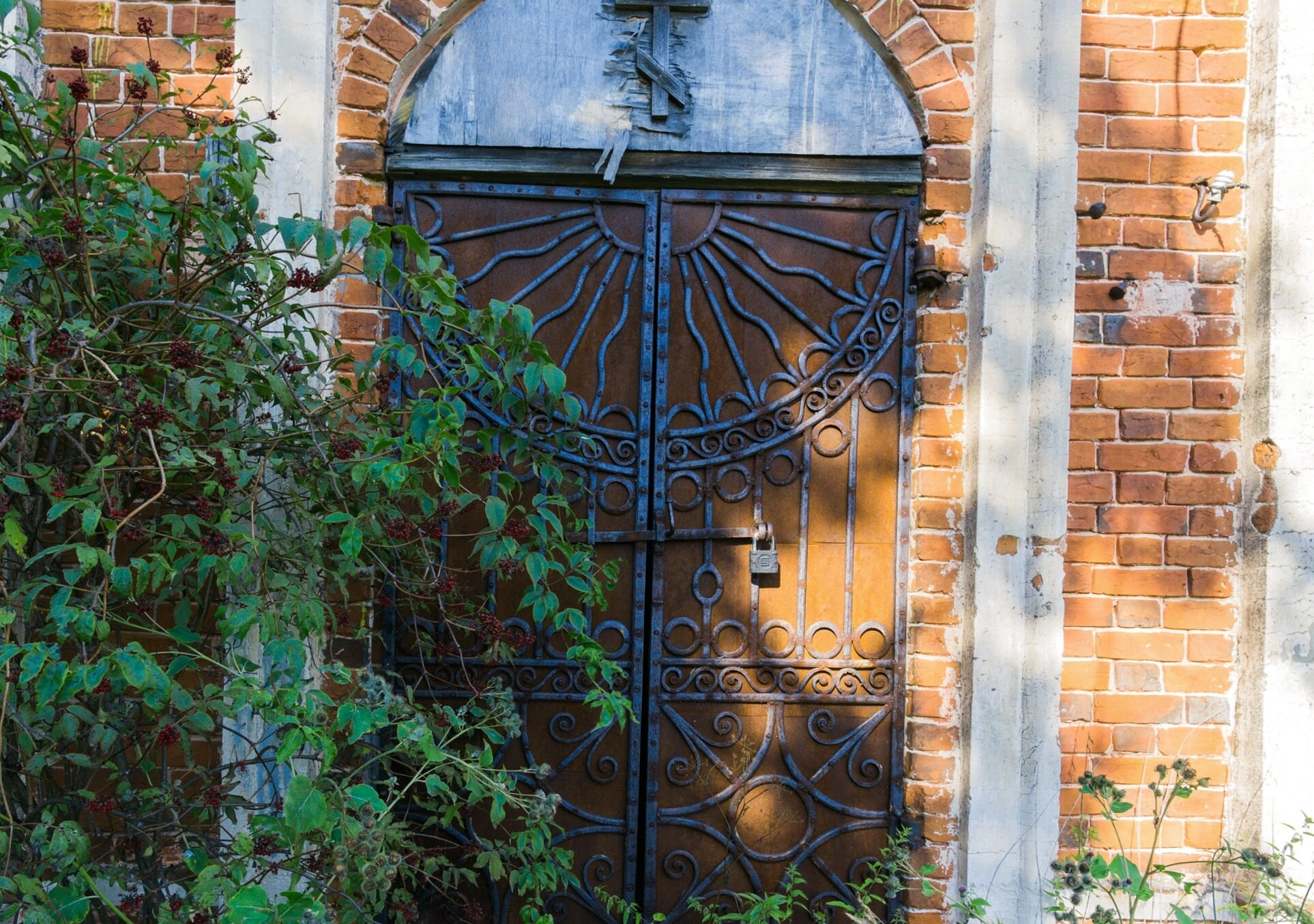 Дверь встроена в мощную кирпичную стену храмовой постройки, а над ней хорошо различим завершающий элемент арочного проёма, венчаемый каменным крестом — символом спасения и искупления. Слева от входа произрастает куст, вероятно, черёмухи или бузины, добавляющий природной мягкости строгому архитектурному облику.