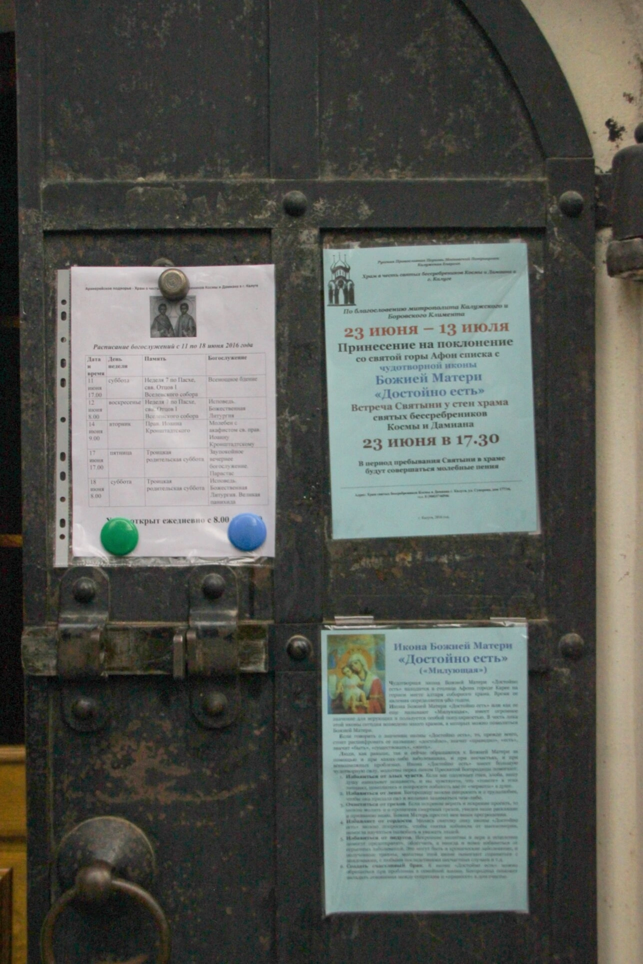 Рядом расположено расписание работы храма, сообщающее о времени, когда двери святыни открыты для всех желающих помолиться. Сам храм Космы и Дамиана, чей вход изображён на снимке, является одной из старейших церквей Калуги и объектом культурного наследия, привлекающим как паломников, так и ценителей православной архитектуры.
