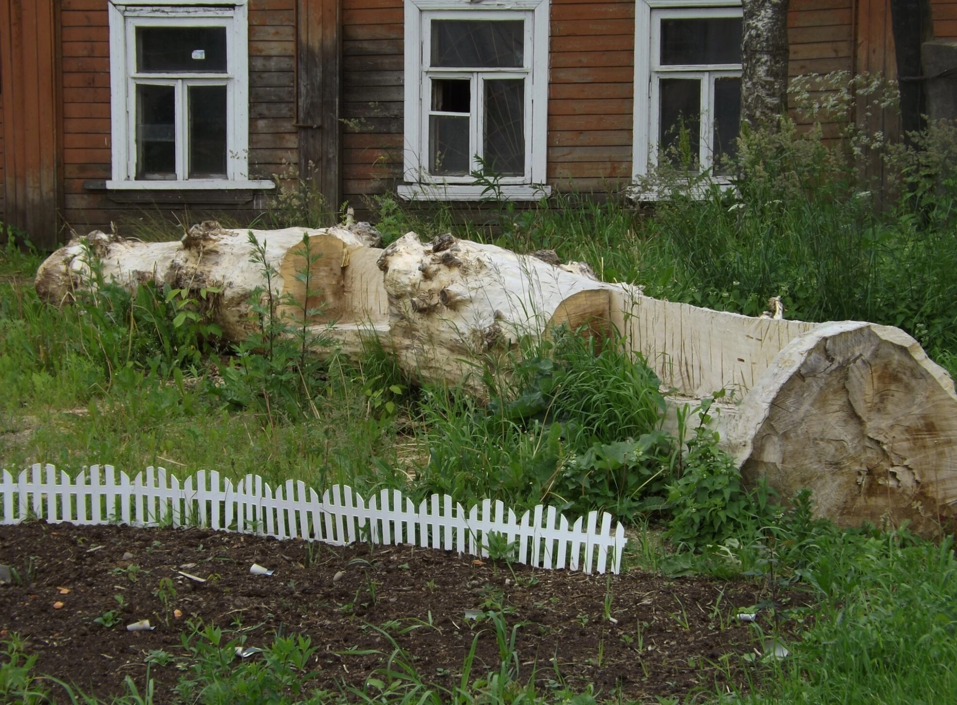 На представленной фотографии запечатлён уголок двора одной из построек Свято-Введенского Тихвинского женского монастыря. На переднем плане виден участок земли, огороженный простым деревянным штакетником, что символизирует традиционный уклад монастырского хозяйства, направленный на собственное благоустройство и самообеспечение общины. Частично обработанное бревно, лежащее на траве, свидетельствует о непрестанных трудах насельниц обители по содержанию и ремонту многочисленных деревянных строений монастырского комплекса.