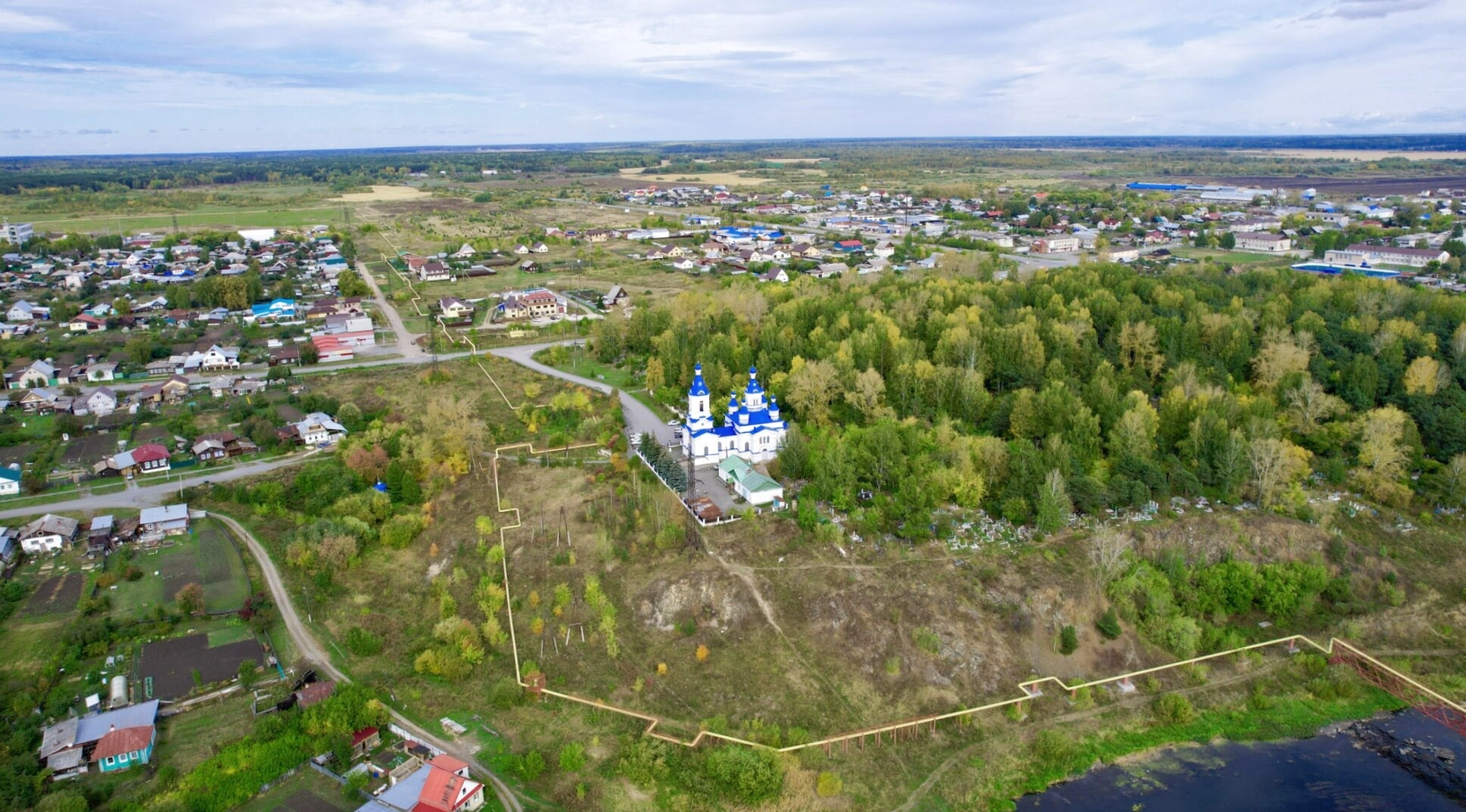 Городская застройка Алапаевска органично вписана в природный ландшафт, образуя единое пространство, где духовный центр естественно сочетается с жилой средой. Выраженный рельеф местности с перепадами высот добавляет фотографии особую динамику и живописность.