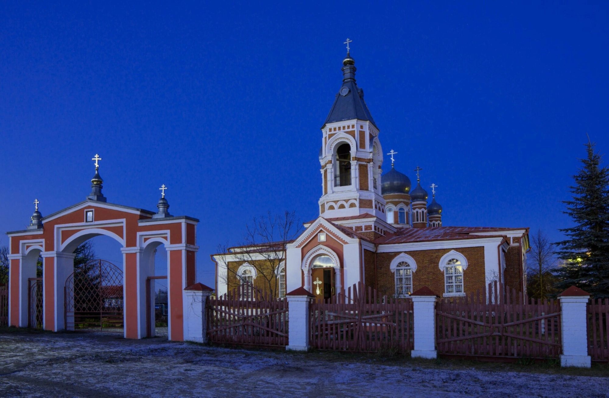 Главным объектом на снимке выступает сам храм, выполненный из красного кирпича с выразительными белыми декоративными элементами и оконными наличниками. Архитектурный облик церкви гармонично дополняет стройная колокольня, увенчанная изящным шпилем и золочёным крестом, а также центральный купол, сияющий традиционной православной главкой. Перед храмом виднеются массивные арочные ворота, выдержанные в едином с церковью цветовом решении и стиле, что формирует целостный и благолепный вид священного места.