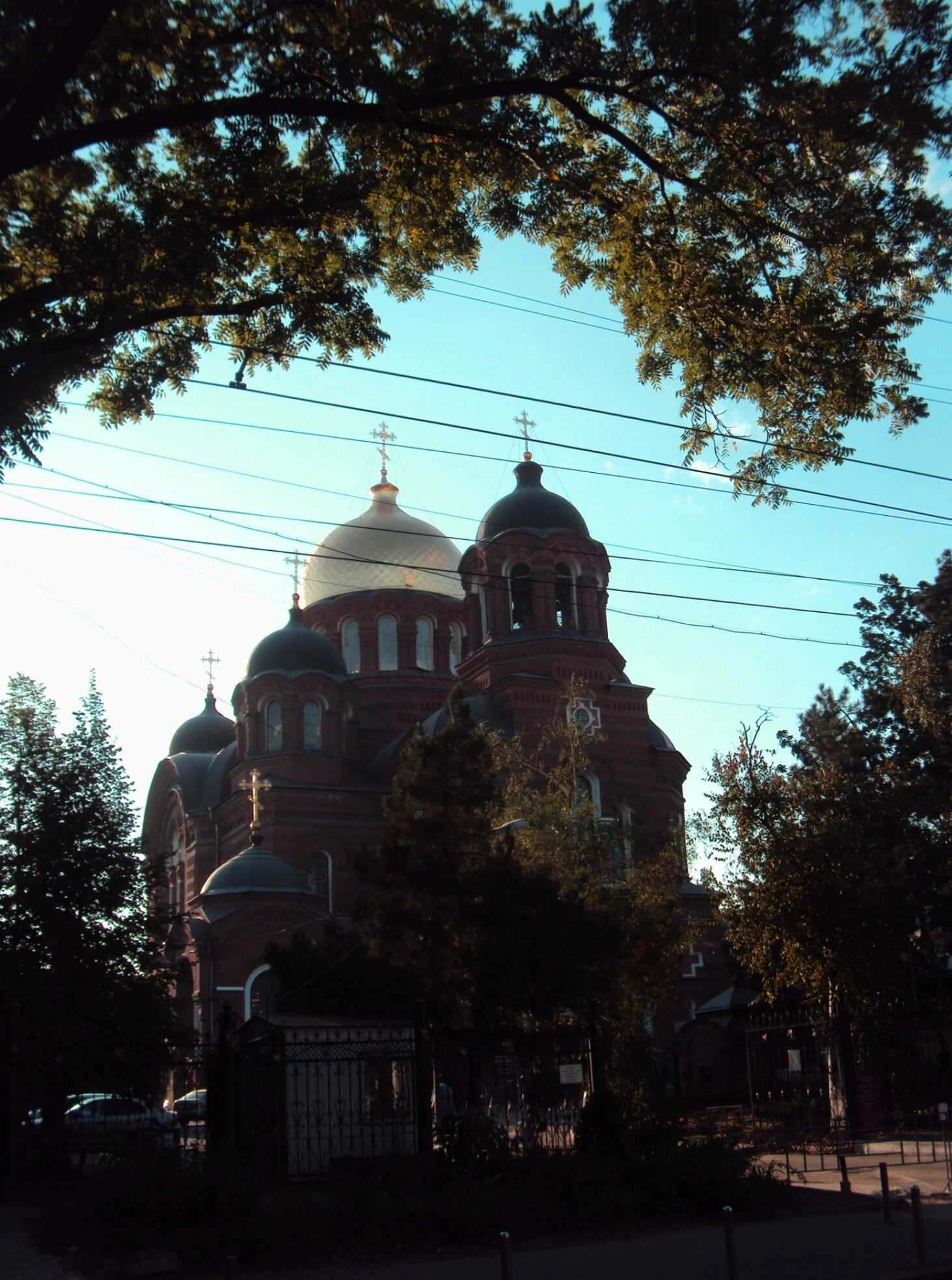 Снимок выполнен в ясный солнечный день, когда позолоченные купола храма сияют в лучах южного солнца. Центральный массивный купол и изящные главки боковых приделов создают традиционную для русского церковного зодчества композицию. Краснокирпичные стены собора демонстрируют характерные для конца XIX века архитектурные решения, сочетающие византийские традиции с элементами русско-византийского стиля.