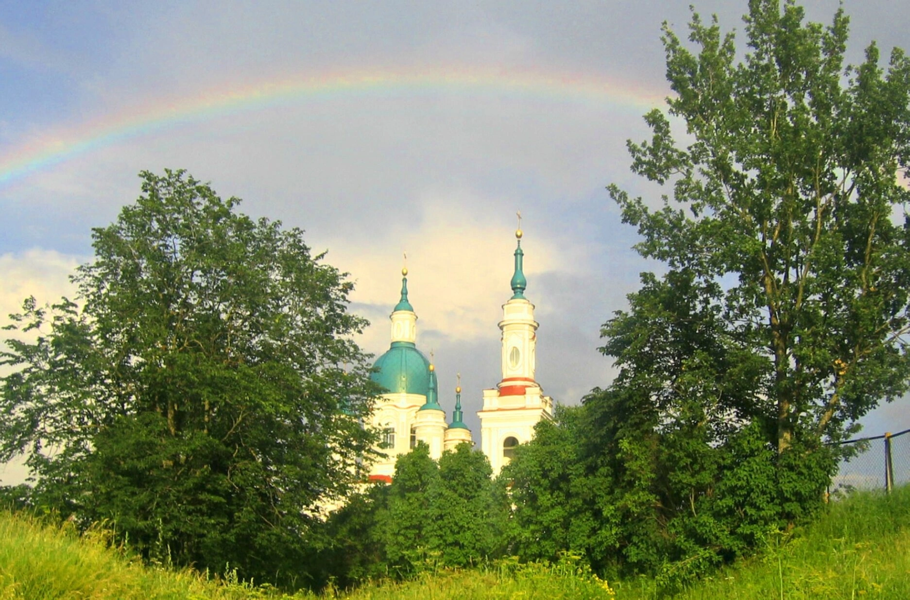 На фотографии запечатлён величественный Екатерининский собор, находящийся в городе Кингисеппе Ленинградской области. В момент съёмки над святым местом и градом сим явилось удивительное и прекрасное явление — радуга, восхитительно сияющая на небе после дождя. Божий знак, застывший в небесах, словно осеняет благодатью этот древний православный храм.