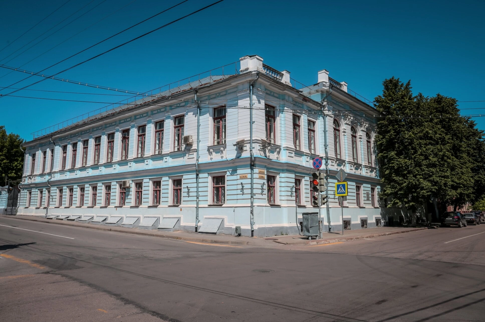 На представленной фотографии запечатлено историческое здание Елецкого городского краеведческого музея, расположенное по адресу: город Елец, Липецкая область. Данное сооружение является значимым памятником градостроительства и архитектуры, внесённым в реестр объектов культурного наследия.