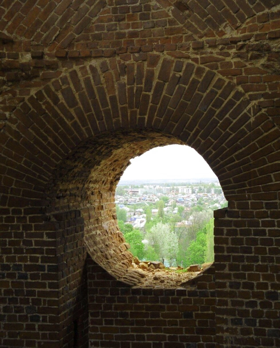 На представленной фотографии запечатлён уникальный вид через круглое арочное окно Елецкого Троицкого монастыря, являющегося одной из значимых православных святынь города Ельца. Святая обитель, расположенная по координатам 52.625368, 38.480950, предстаёт перед зрителем в архитектурной детали - древнем кирпичном проёме, обрамляющем панораму города.