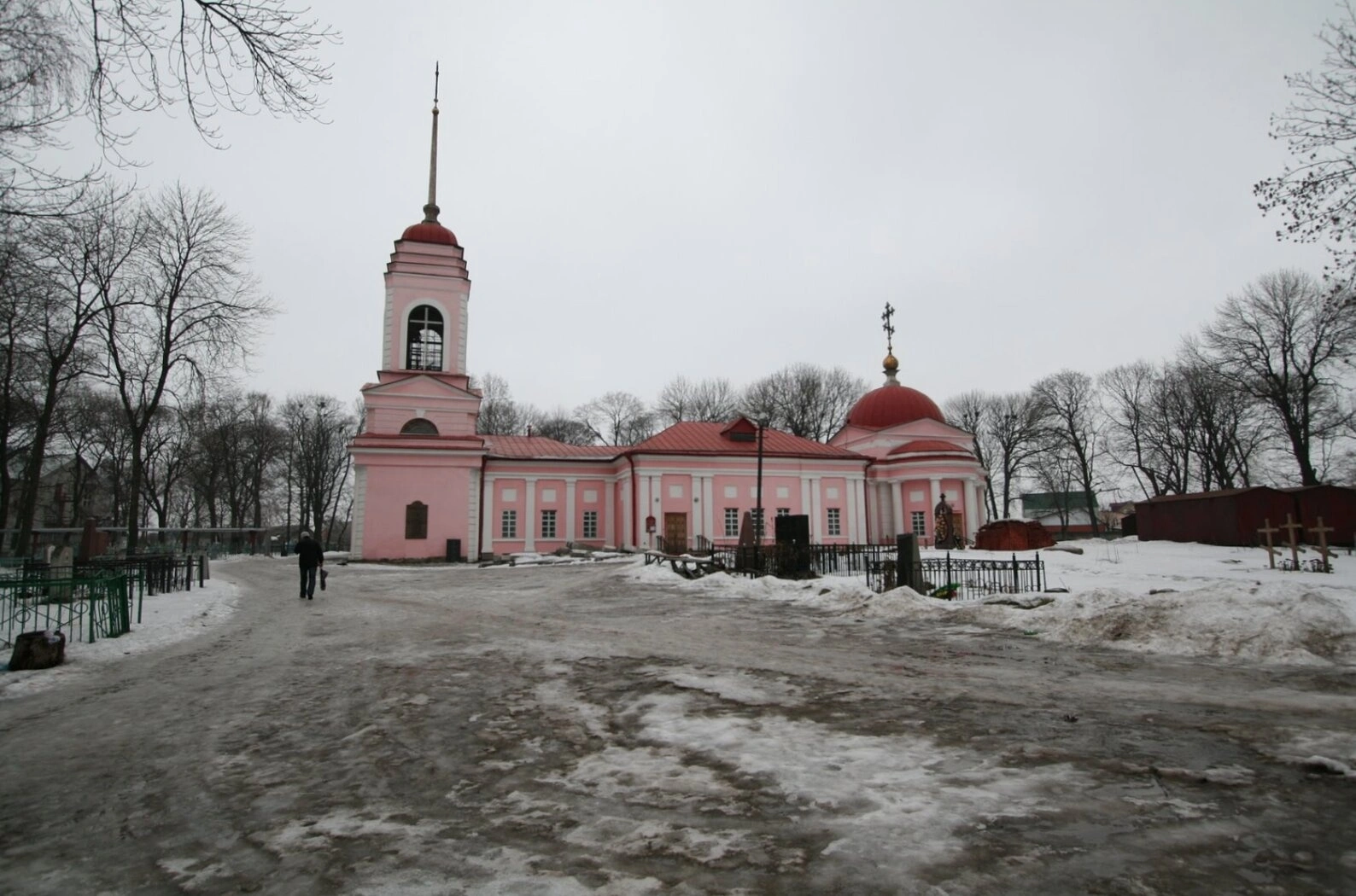Снимок сделан в зимний период, что придает фотографии особую атмосферу духовного сосредоточения и умиротворения. Заснеженная земля и голые ветви деревьев создают лаконичный зимний пейзаж, на фоне которого розовое здание храма выглядит особенно выразительно. Территория вокруг церковного здания частично ограждена металлическим забором, что свидетельствует о благоустройстве церковного участка.