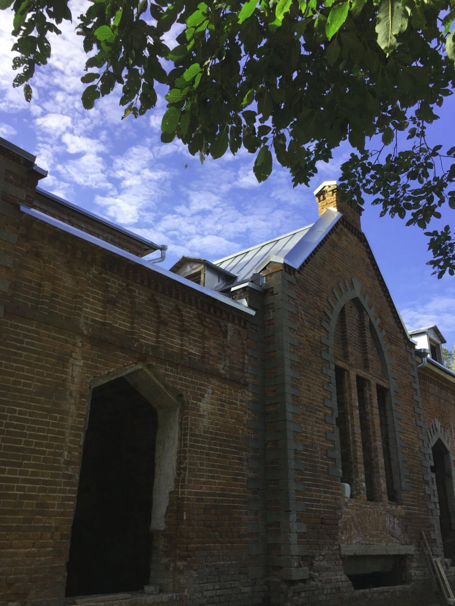 Основным материалом постройки служит красный кирпич, из которого выложены как плоскости стен, так и богатые декоративные элементы. На снимке хорошо читается крупная полуциркульная закомара, венчающая центральную часть фасада, с группой узких арочных проёмов. Ниже расположен большой прямоугольный проём, который, вероятно, является оконным или дверным. Состояние кирпичной кладки указывает на то, что в момент съёмки здание могло находиться в стадии ремонтных или реставрационных работ, что является важным этапом в жизни любого исторического памятника.