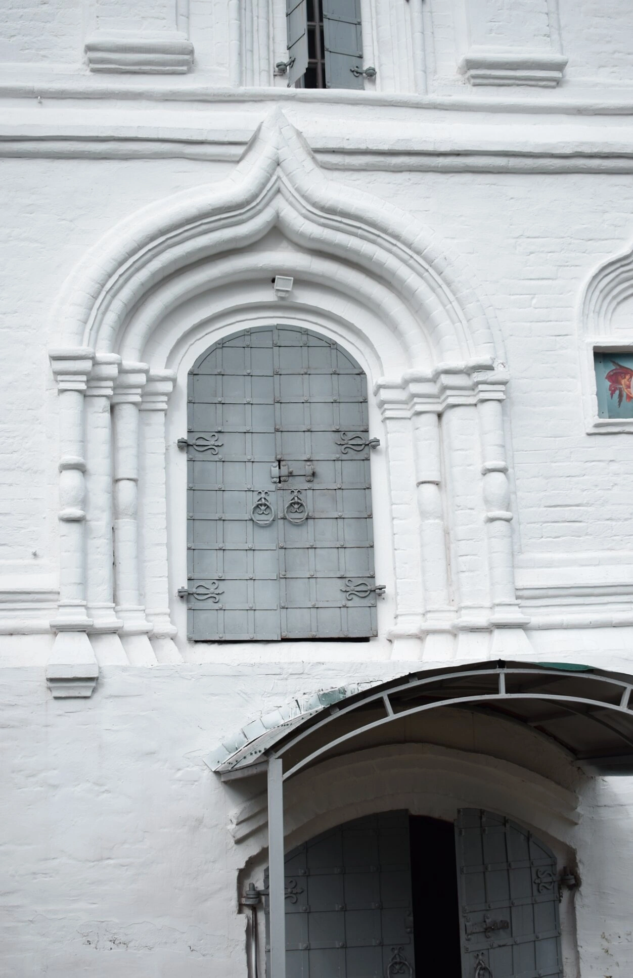 Центральным элементом композиции служит массивная дверь в арочном проёме, выполненная из тёмного металла и украшенная декоративными коваными петлями и ручками. Дверной проём обрамлён белокаменными резными элементами, характерными для традиционного русского храмового зодчества. Над входом просматривается фрагмент настенной росписи, сохранившейся до наших дней.