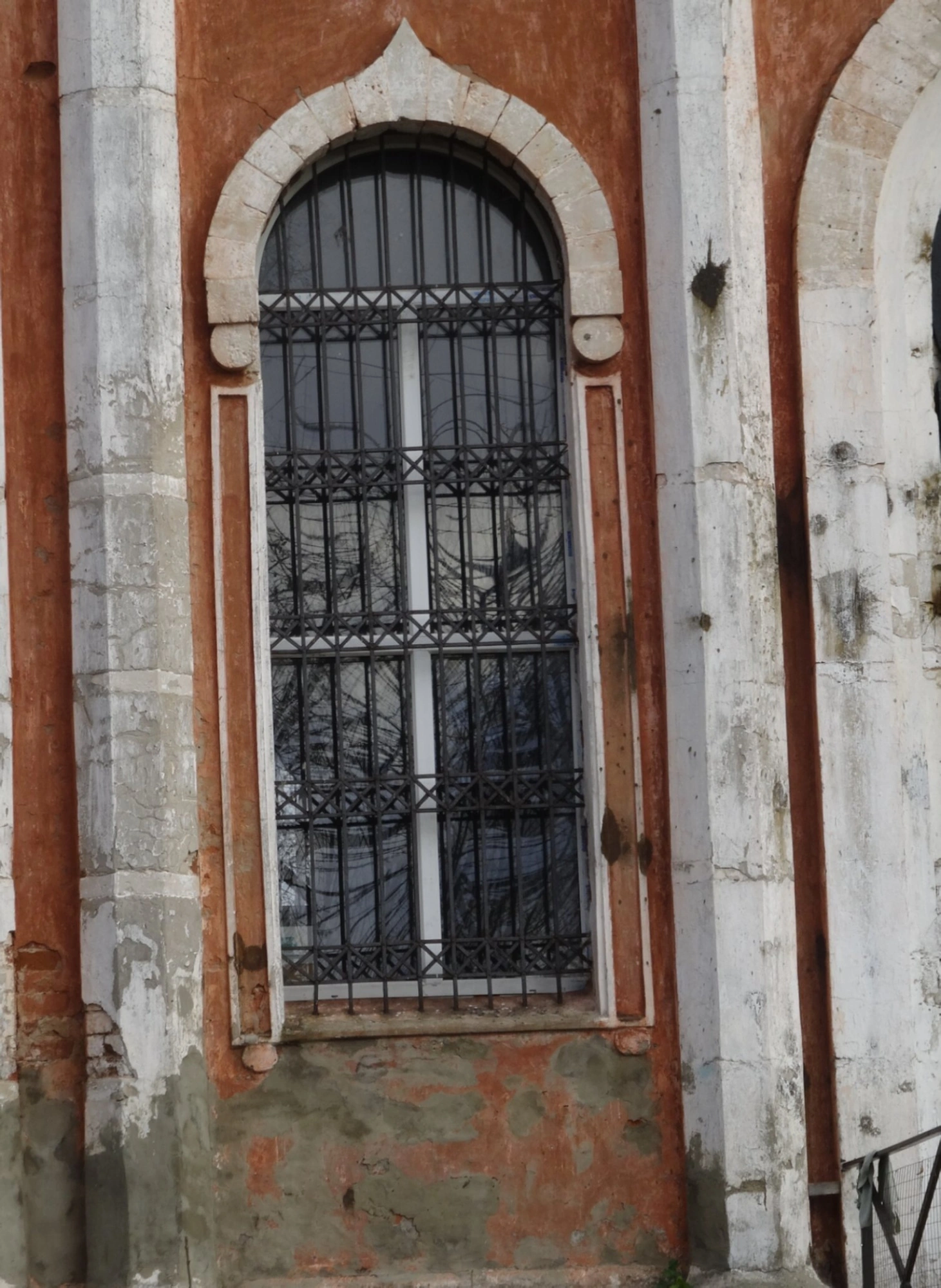 Фрагмент стены демонстрирует первоначальную отделку из красной штукатурки с выделенными белым цветом архитектурными элементами — карнизами и декоративными поясами, которые дренажируют плоскость фасада и придают ему строгость и величие. На момент съёмки на поверхности видны следы времени: обветшание штукатурного слоя и утраты декора, что подчёркивает историческую ценность объекта и говорит о необходимости сохранения духовного и культурного наследия.
