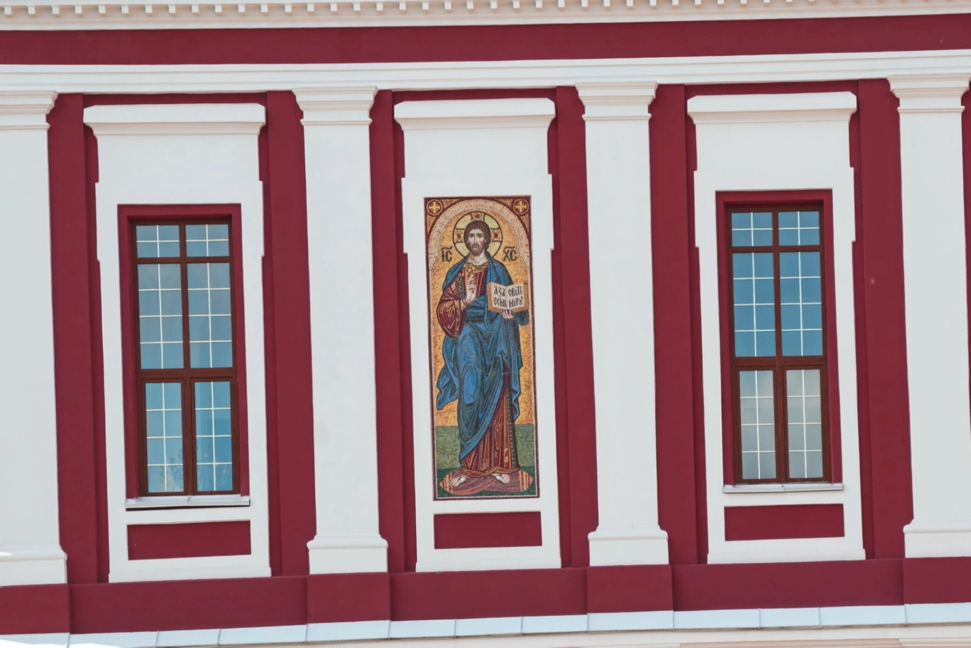 Фасад собора, выполненный в насыщенных красно-белых тонах, демонстрирует характерное для храмового зодчества сочетание монументальности и изящества. Глубокий красный цвет стен символизирует торжественность и жертвенность, в то время как белоснежные пилястры, карнизы и декоративные элементы олицетворяют чистоту и святость. Подобный цветовой контраст не только создаёт визуальный объём, но и отражает глубокую богословскую символику.