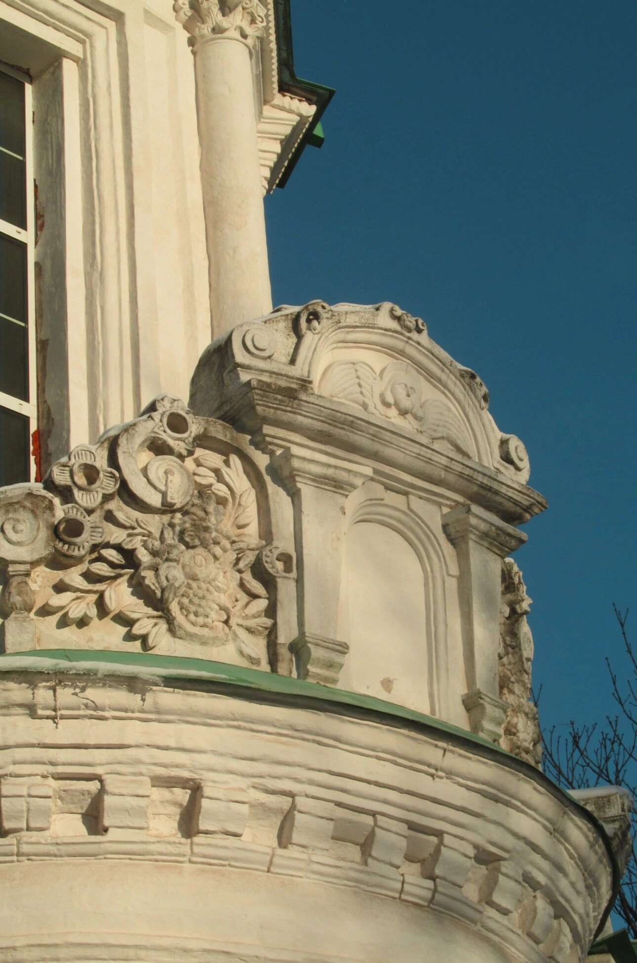 Таким образом, фотография позволяет детально рассмотреть изысканный белокаменный декор Знаменской церкви, который представляет собой синтез православной символики и западноевропейских барочных форм, создавая неповторимый образ храма-реликвии.