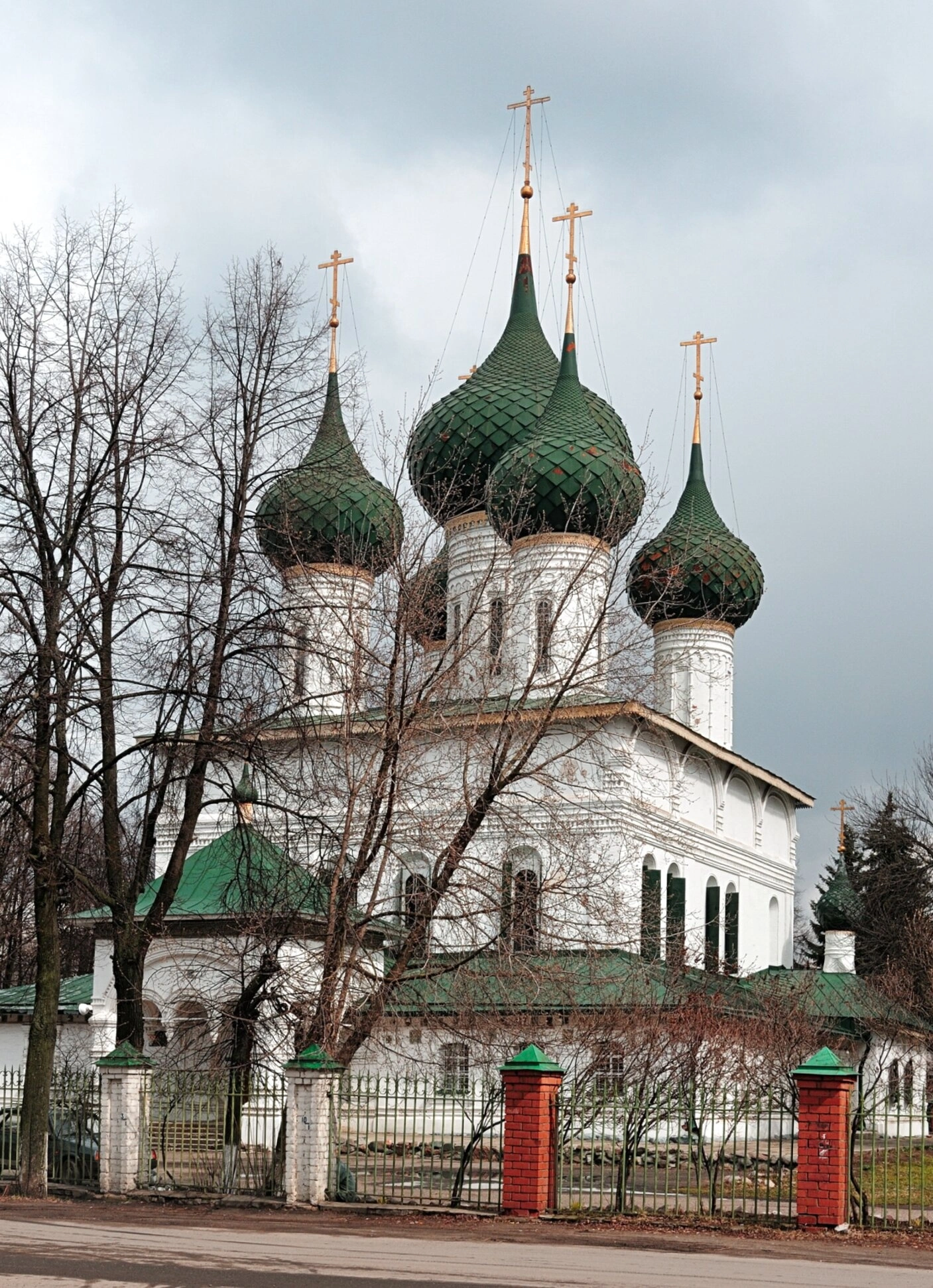 Величественный белоснежный собор возвышается на фоне облачного неба. Его архитектурный облик характерен для традиций Ярославской школы: мощный четверик, увенчанный пятиглавием. Центральная золочёная глава, значительно превосходящая по высоте четыре боковые, символизирует Господа Иисуса Христа и четырёх евангелистов. Главы, покрытые яркой зелёной поливной черепицей, создают яркий цветовой акцент и устремляют взор в небесную высь.