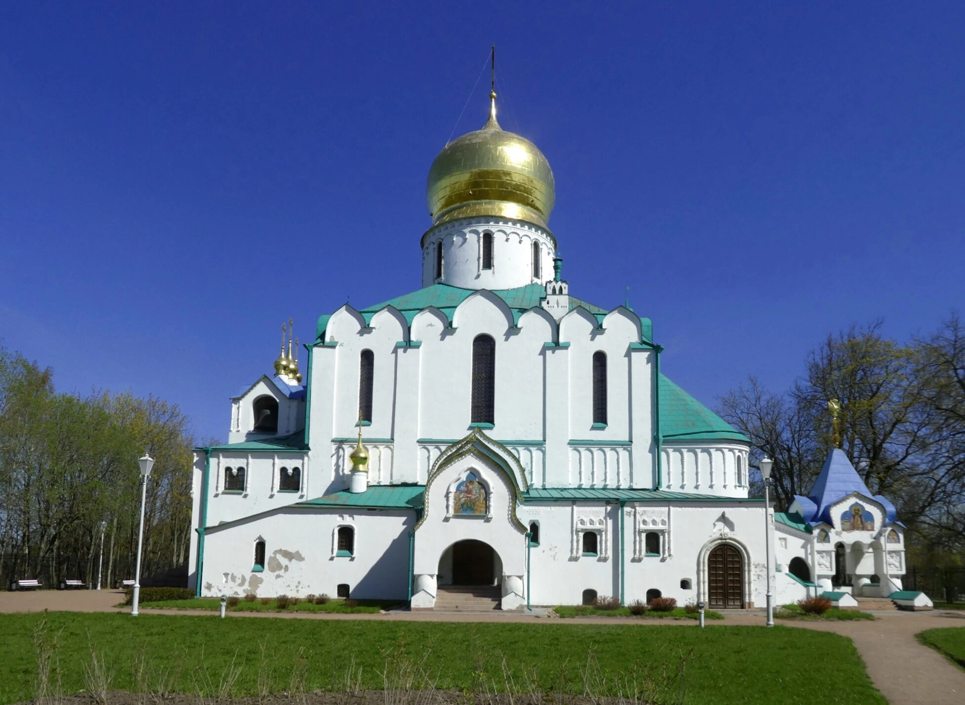 На фотографии запечатлён величественный Феодоровский Государев собор, расположенный в живописной местности города Пушкина (Царское Село). Этот православный храм был возведён в 1912 году по высочайшему повелению императора Николая II в честь 300-летия царствования Дома Романовых. Собор освящён в честь Феодоровской иконы Божией Матери — древней чудотворной святыни, особо почитаемой царской семьёй.