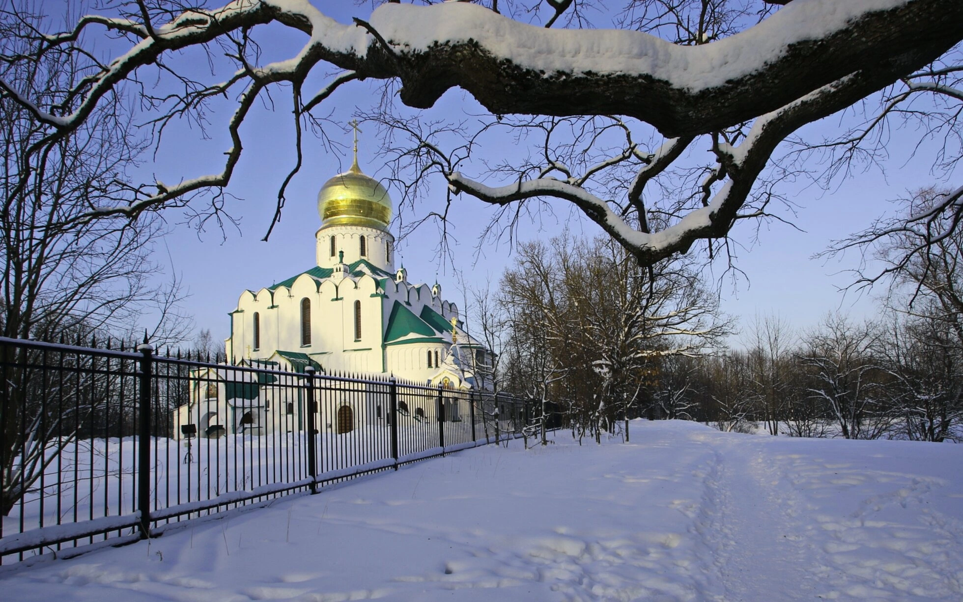Белокаменные стены храма и зелёные кровли выделяются на фоне заснеженного пейзажа, а ажурная чёрная ограда подчёркивает sacredness и особый статус этой территории. Собор был возведён по повелению Государя Императора Николая II как полковой храм Сводного пехотного полка и Конвоя и освящён в 1912 году во имя Феодоровской иконы Божией Матери — глубоко чтимой родовой святыни Дома Романовых.
