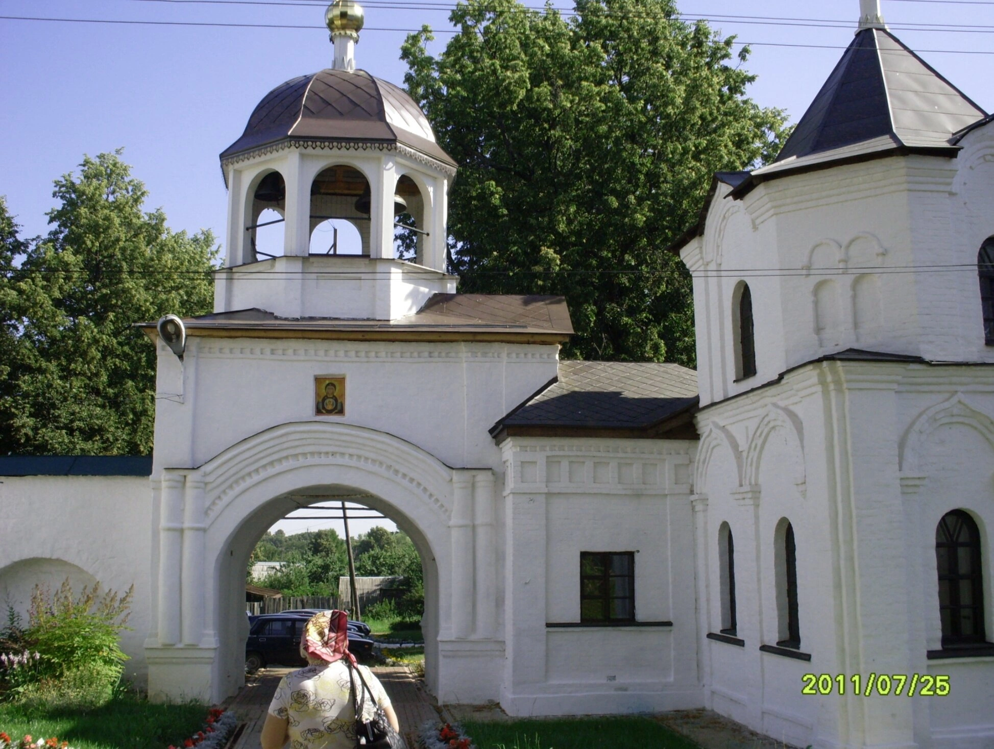 На переднем плане снимка изображена надвратная церковь во имя великомученика Феодора Стратилата — небесного покровителя обители. Белоснежный храм, увенчанный золочёной главкой, представляет собой прекрасный образец русского церковного зодчества. Арочный проём ворот приглашает верующих на территорию монастыря, символизируя духовный путь от мирской суеты к молитвенному уединению.