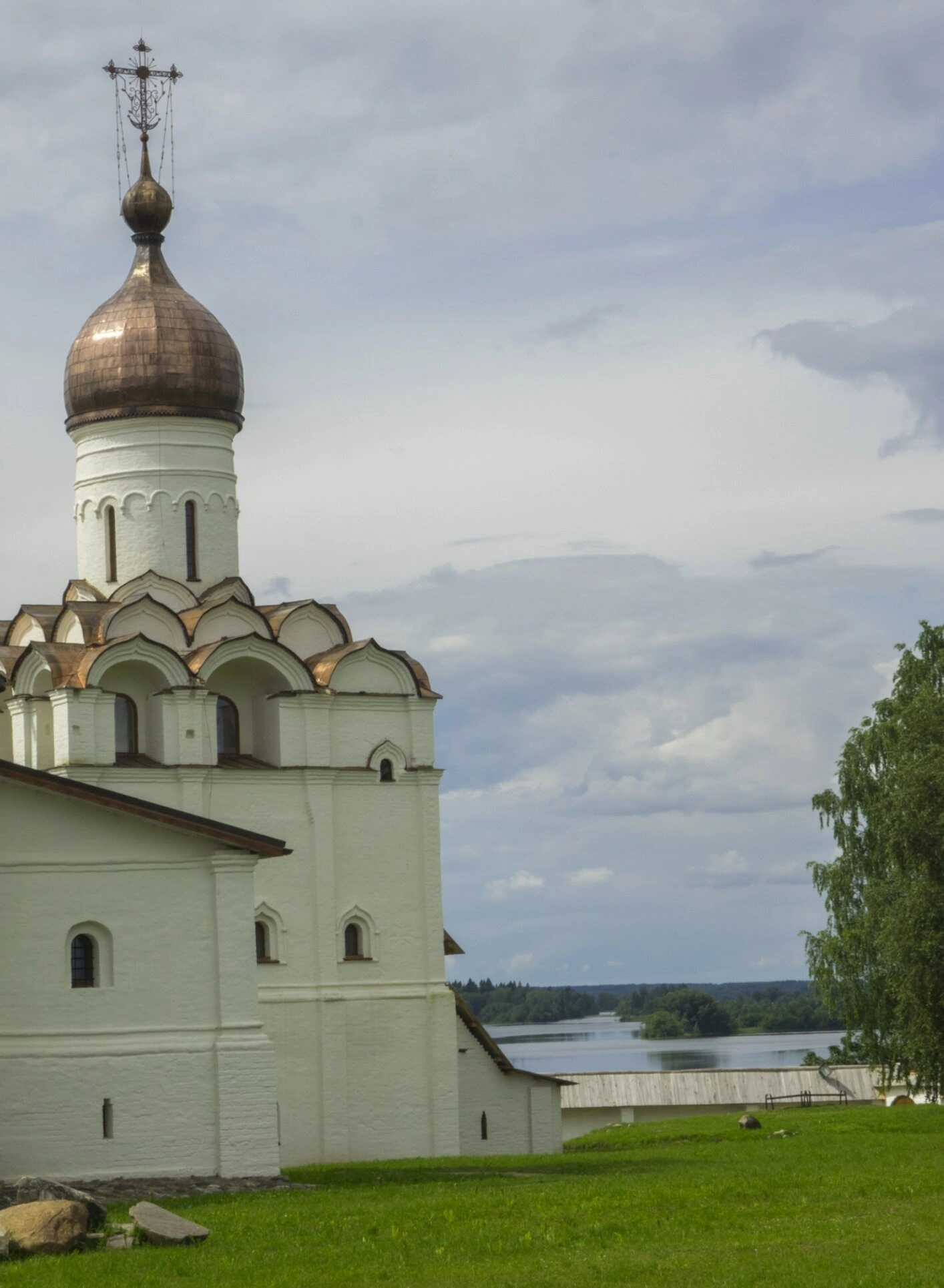 На фотографии можно видеть часть северной крепостной стены и одну из башен монастырской ограды, увенчанную православным крестом, символизирующим победу над грехом и смертью. За стенами виднеется глава соборного храма. Святая обитель гармонично вписана в окружающий богозданный ландшафт: зелёные луга, тихие воды озера и бескрайние северные леса создают атмосферу благодатного уединения и молитвенного покоя, что и привлекало сюда на протяжении веков иноков и подвижников.