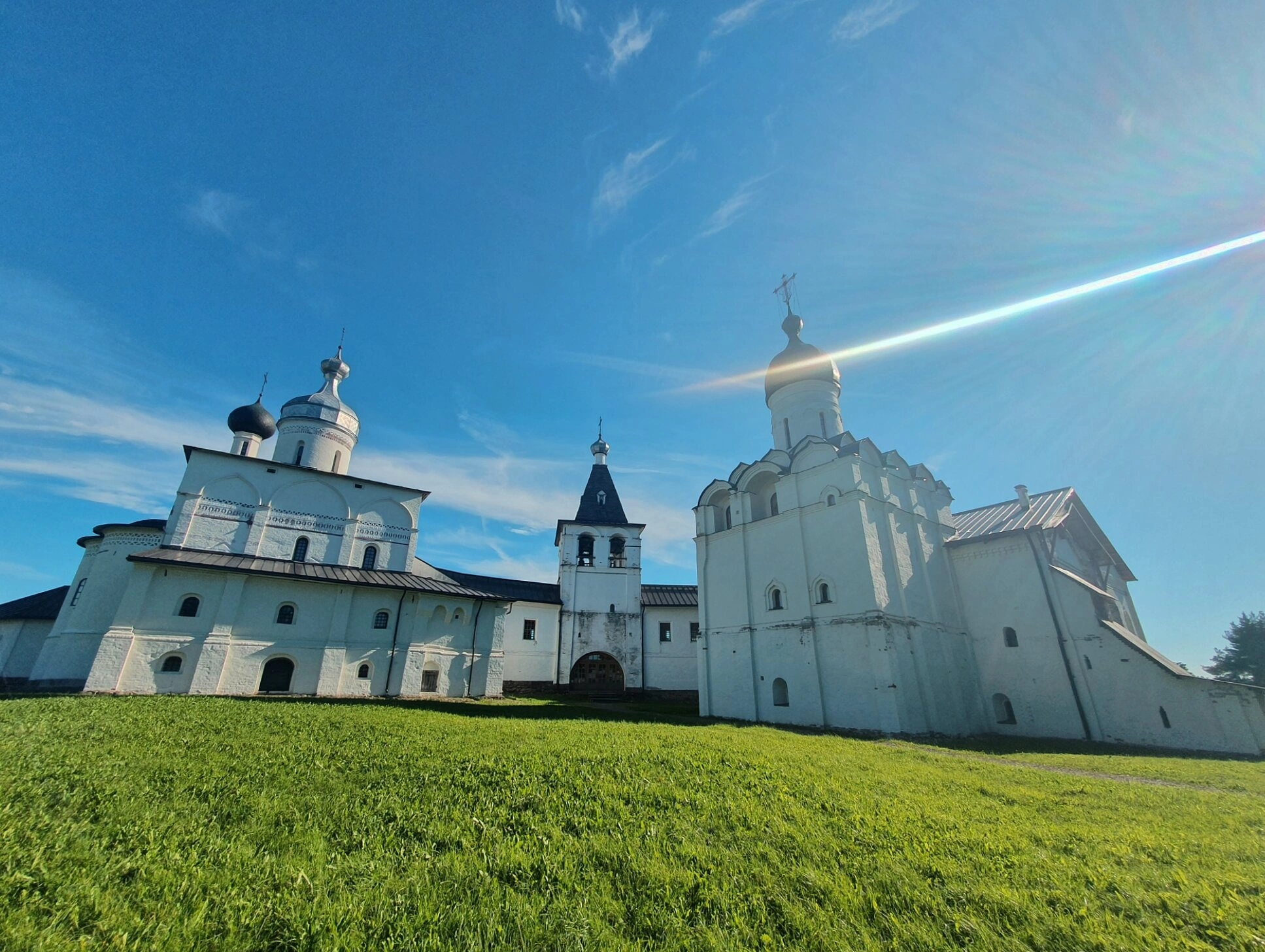На фотографии запечатлён ансамбль Ферапонтова Белозерского Богородице-Рождественского монастыря, расположенный в селе Ферапонтово Вологодской области. Эта древняя обитель, основанная в 1398 году преподобным Ферапонтом, является одним из духовных центров Русского Севера и объектом Всемирного наследия ЮНЕСКО. Монастырь уникален своей архитектурой XV–XVII веков и единственными в мире сохранившимися фресками великого иконописца Дионисия, созданными в 1502 году.