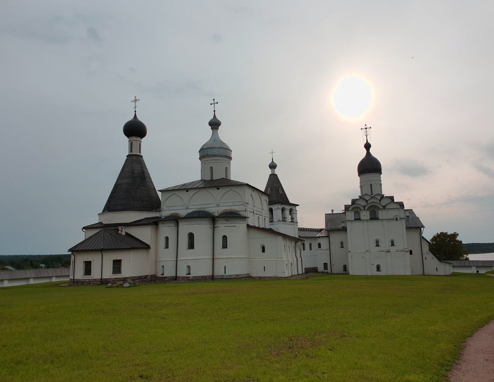 Белокаменные стены храмов, увенчанные традиционными луковичными главами с крестами, ярко выделяются на фоне зелёного луга и водной глади озера, создавая образ неземной красоты и духовного спокойствия. Облачное небо, запечатлённое на фотографии, подчёркивает суровую и величественную атмосферу этого намоленного места. Ферапонтов монастырь, включённый в список Всемирного наследия ЮНЕСКО, является не только памятником истории и культуры, но и действующим женским монастырём Русской Православной Церкви, привлекающим паломников и ценителей древнерусского искусства со всего мира.