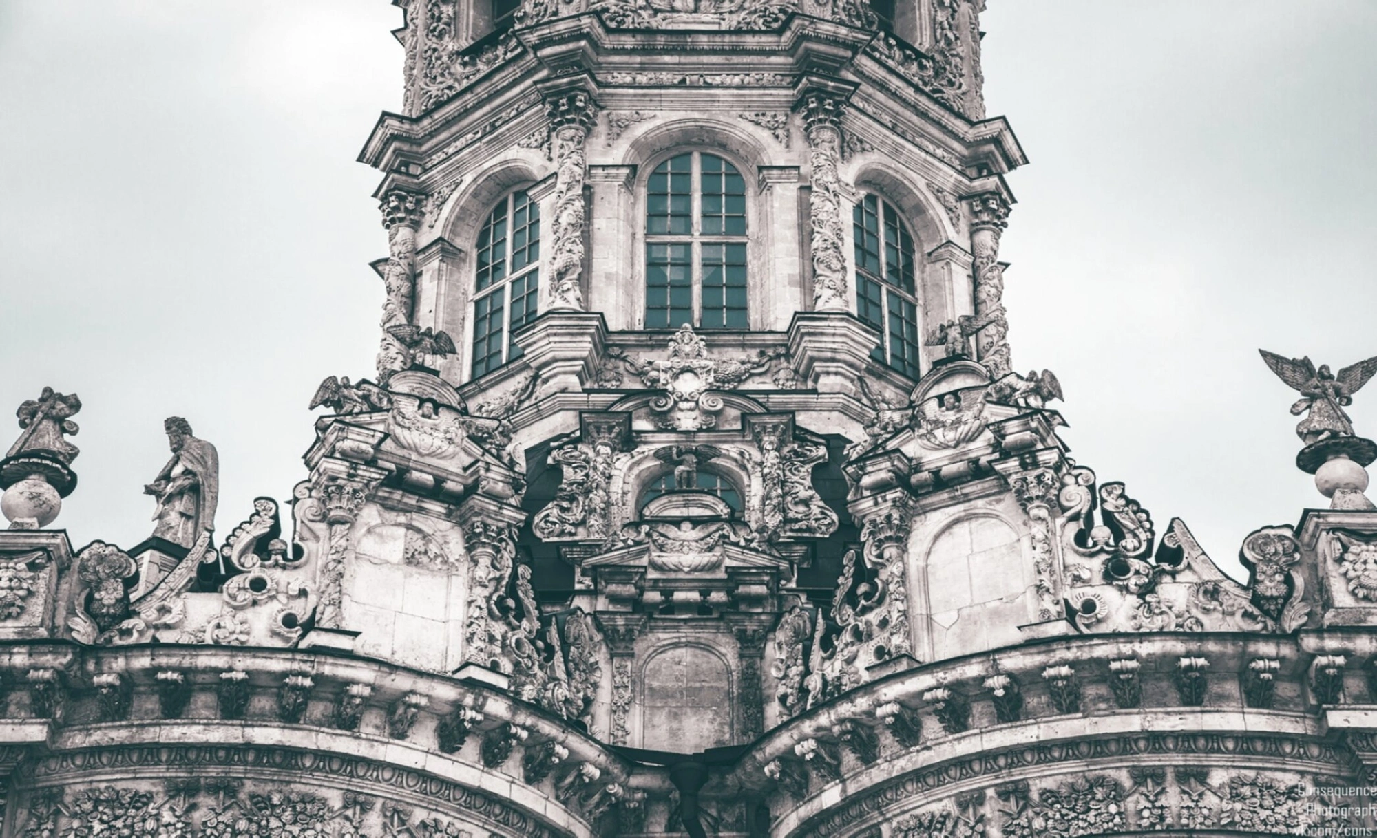 Особое внимание привлекает скульптурное убранство. Фасады обильно украшены изваяниями святых и ангелов, а также сложным цветочным и растительным орнаментом. Подобное обилие скульптуры, расположенной на крыше и фасаде, нехарактерно для православного храмостроения той эпохи и сближает облик церкви с западноевропейскими барочными соборами.