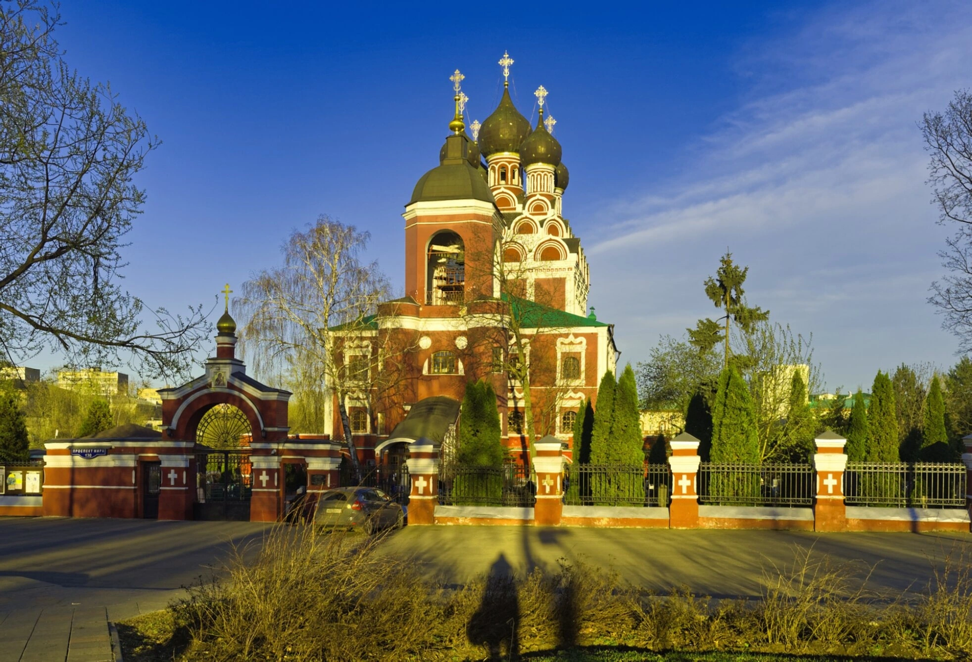 Фотография сделана в светлый, солнечный день. Естественное освещение подчёркивает чистоту голубого неба, яркость красок храма и отчётливость всех архитектурных деталей. Длинные тени на переднем плане указывают на время съёмки, создавая ощущение покоя и умиротворения, свойственное этому намоленному месту. Людей, изображённых крупным планом, на фотографии нет.
