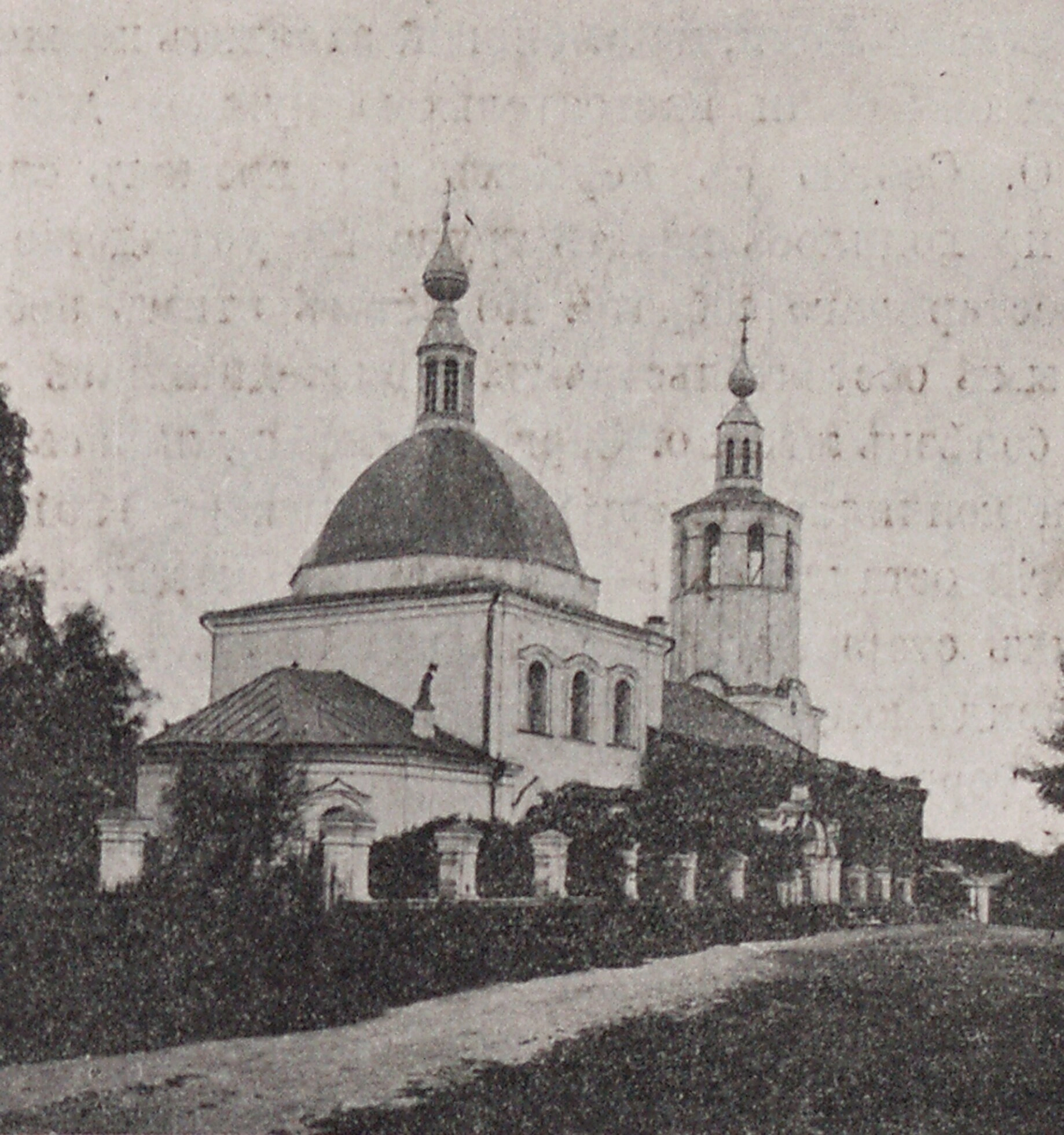 Чёрно-белая фотография передаёт строгую красоту храмового ансамбля, окружённого невысокой оградой. На переднем плане видна грунтовая дорога и скромная растительность, что, вместе с отсутствием современных элементов, указывает на исторический характер снимка, вероятно, сделанного в конце XIX или начале XX века. Главный престол храма освящён в честь праздника Всех Святых, а его боковые приделы — в честь иконы Божией Матери «Всех Скорбящих Радость» и святых праведных Симеона Богоприимца и Анны Пророчицы. Эта святыня, пережившая войны и лихолетья, и поныне является действующим православным храмом и объектом культурного наследия федерального значения, призывающим верующих к молитве.