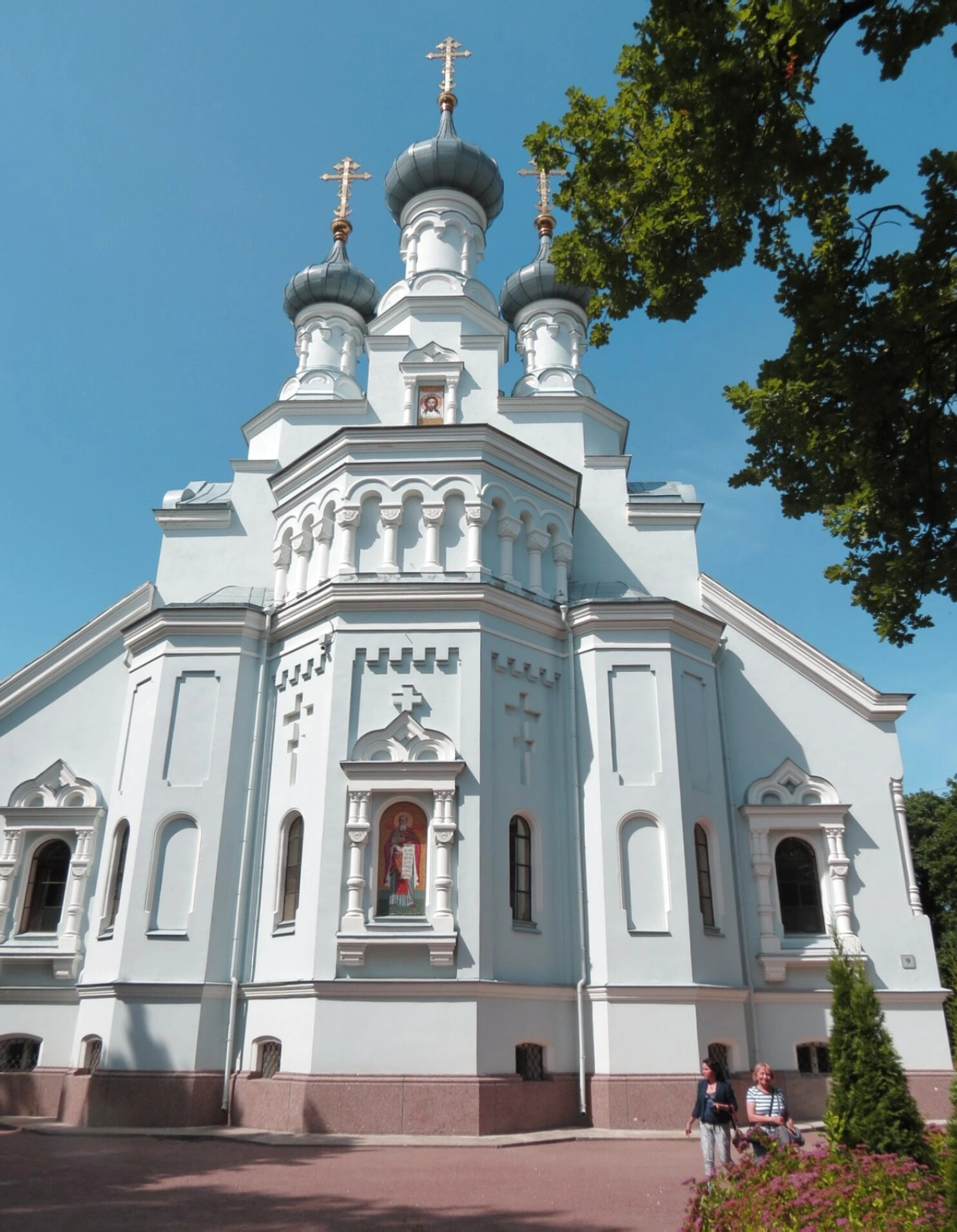 Собор венчается пятью куполами серого цвета, увенчанными златоглавыми православными крестами. Центральная глава — самая крупная, а четыре меньшие расположены по углам. Фасад обильно украшен декоративными элементами: арочными окнами, рядами кокошников, пилястрами и резными наличниками. Над входом, а также в нишах фасада размещены мозаичные или фресковые изображения святых; в центральной нише нижнего яруса чётко видна икона в полный рост. Территория вокруг храма вымощена, справа в кадр попадает крона дерева с зелёной листвой, у основания здания виднеются небольшие кустарники. На переднем плане справа сидят два человека, однако их изображение не является крупным планом.