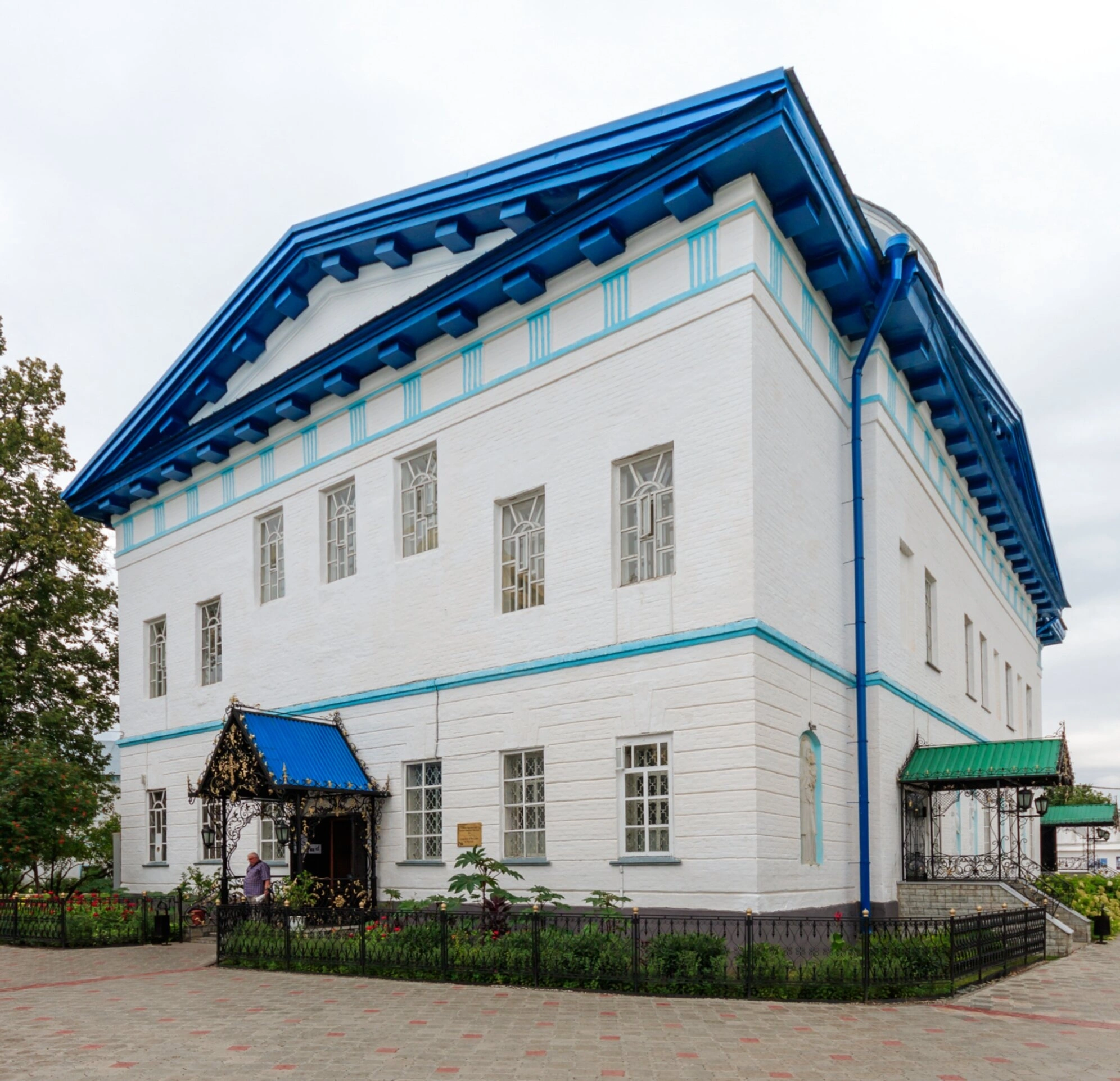Двухэтажное строение выкрашено в белый цвет, а его крыша и декоративные элементы выполнены в ярко-синей гамме. Под карнизом протянут фриз с вертикальными синими полосами. На обоих этажах ритмично расположены высокие арочные окна, характерные для русской монастырской архитектуры.