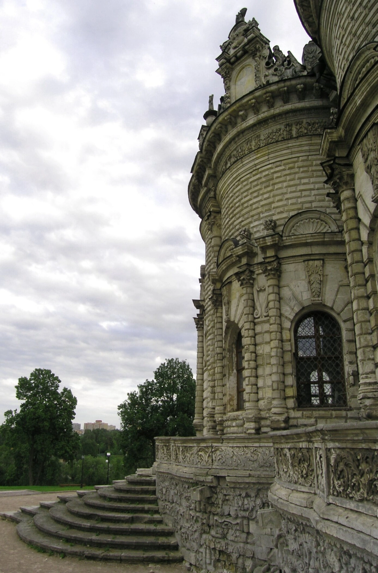 На переднем плане снимка видна каменная балюстрада с резными узорами, ограждающая открытое гульбище храма. К главному входу ведёт широкая полукруглая лестница, выложенная из того же белого камня. Такие лестницы, идущие с четырёх сторон, включая алтарную, были редким архитектурным решением для своего времени и подчёркивают особую планировку святыни.
