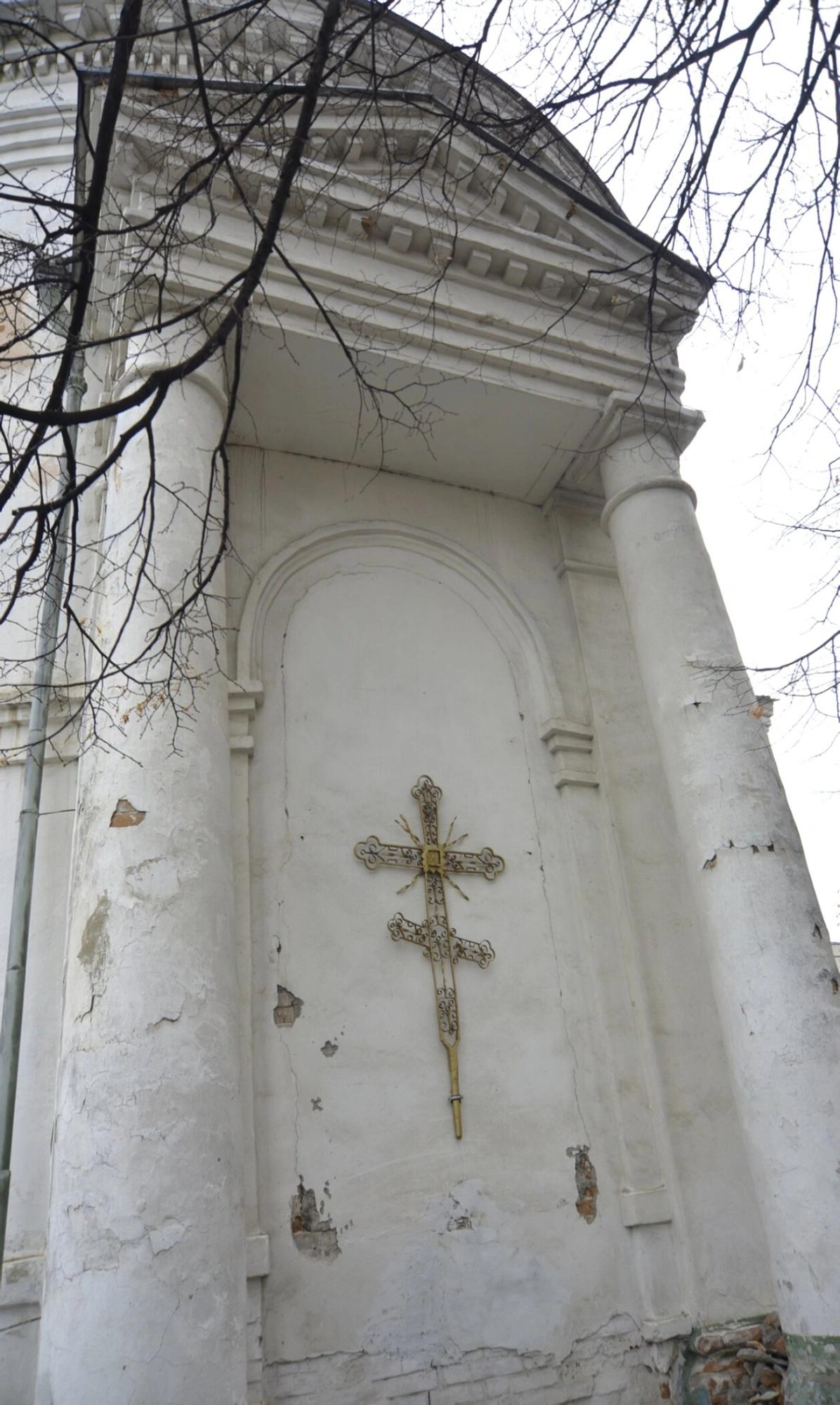 На представленной фотографии запечатлён фрагмент стены одной из старейших православных святынь Тюмени — Всехсвятской церкви-часовни. В центре композиции находится величественный каменный крест, богато украшенный традиционной православной резьбой. Этот крест не только является символом веры, но и представляет собой высокохудожественное произведение церковного искусства, демонстрирующее мастерство сибирских зодчих.
