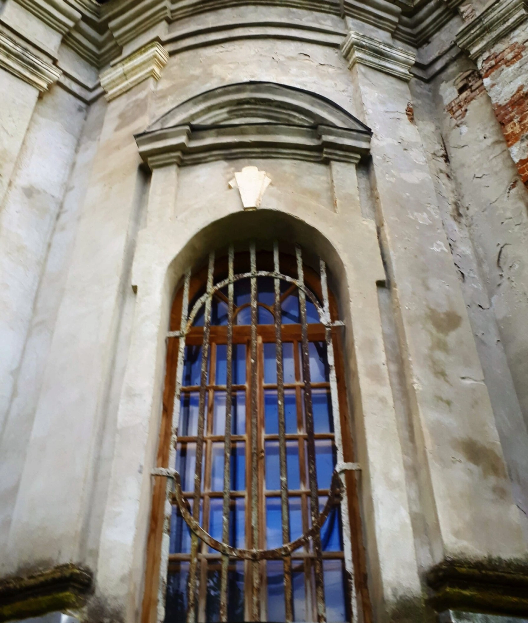 Центральным элементом композиции является арочное окно, оснащенное массивной кованой решеткой. Декоративное обрамление оконного проема и сохранившиеся элементы лепнины демонстрируют характерное для барокко богатство и изящество форм. На поверхности стен читается благородная патина времени, напоминающая о долгой истории этого святого места.