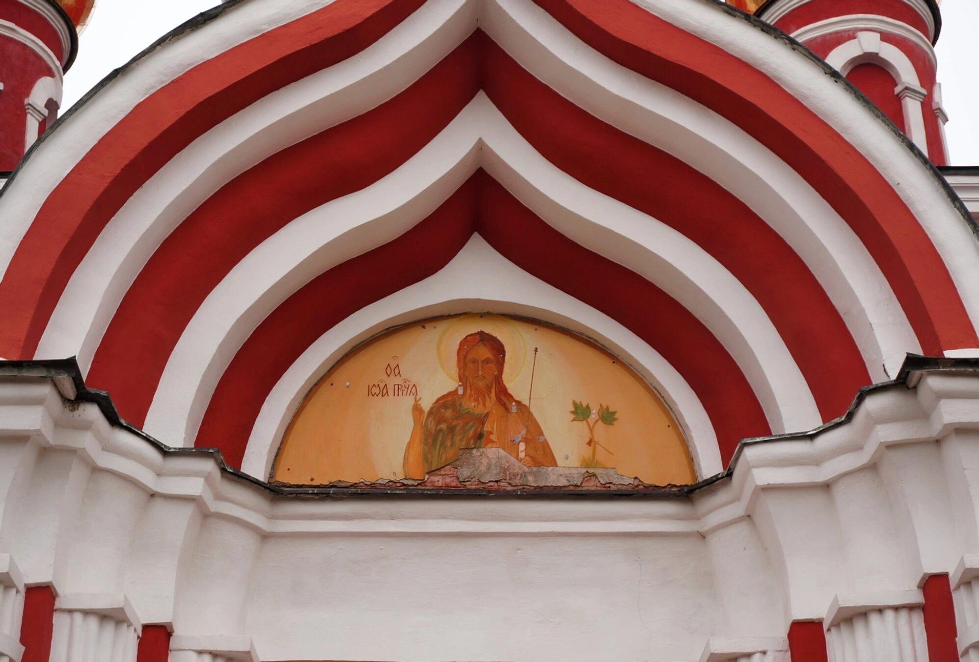 На фотографии запечатлен фрагмент величественного фасада Кафедрального собора Воскресения Христова, что в древнем граде Старая Русса. Крупным планом показана уникальная деталь храмовой архитектуры — декорированный аркатурный пояс, увенчанный традиционным русским кокошником. Элемент выполнен в характерном цветовом сочетании из чередующихся красных и белых полос, что создает торжественный и нарядный облик.