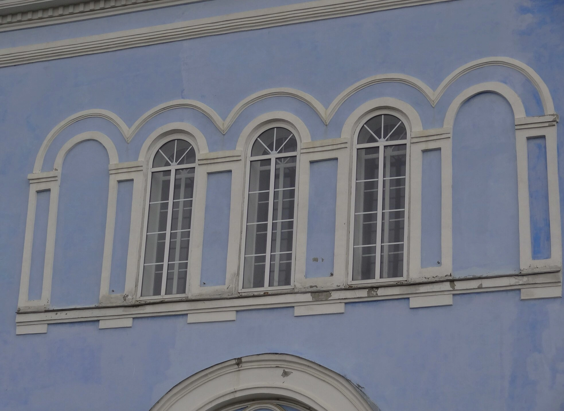 В верхней части композиции выделяются три арочных оконных проёма, характерных для церковной архитектуры. Окна обрамлены белыми наличниками и имеют сложный переплёт, что придаёт им особую изящность и выразительность. По бокам от окон расположены декоративные глухие ниши, также арочной формы, которые имитируют оконные проёмы и служат для создания ритмического равновесия на плоскости стены. Этот архитектурный приём оживляет фасад, придавая ему лёгкость и устремлённость ввысь.