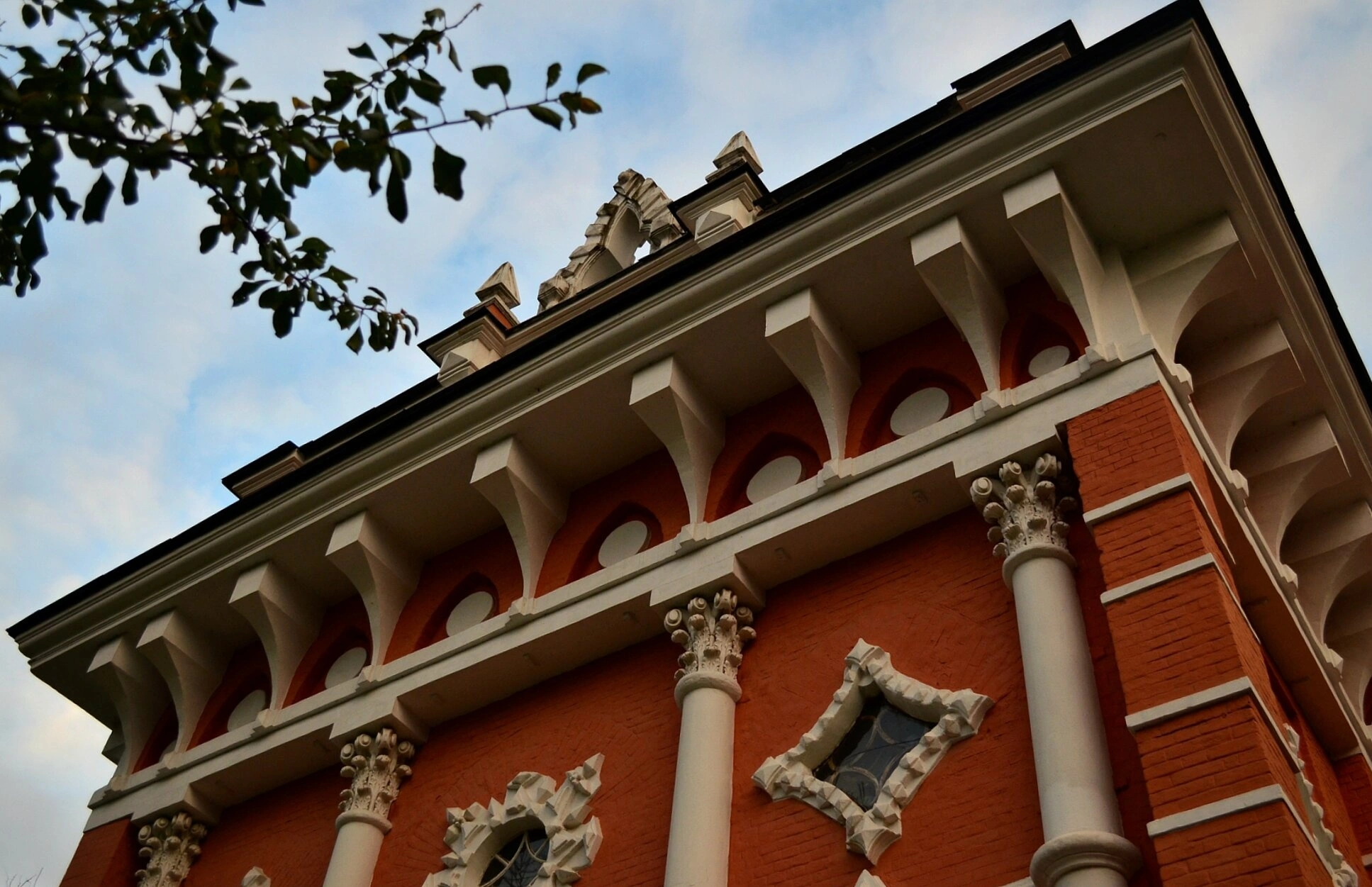 На представленной фотографии запечатлён величественный фрагмент фасада Смоленского храма в граде Ивантеевке Московской области. Вид снизу вверх, устремлённый в небесную высь, позволяет в подробностях рассмотреть благолепие церковной архитектуры, выполненной в традиционном кирпичном стиле с обильным декоративным убранством.