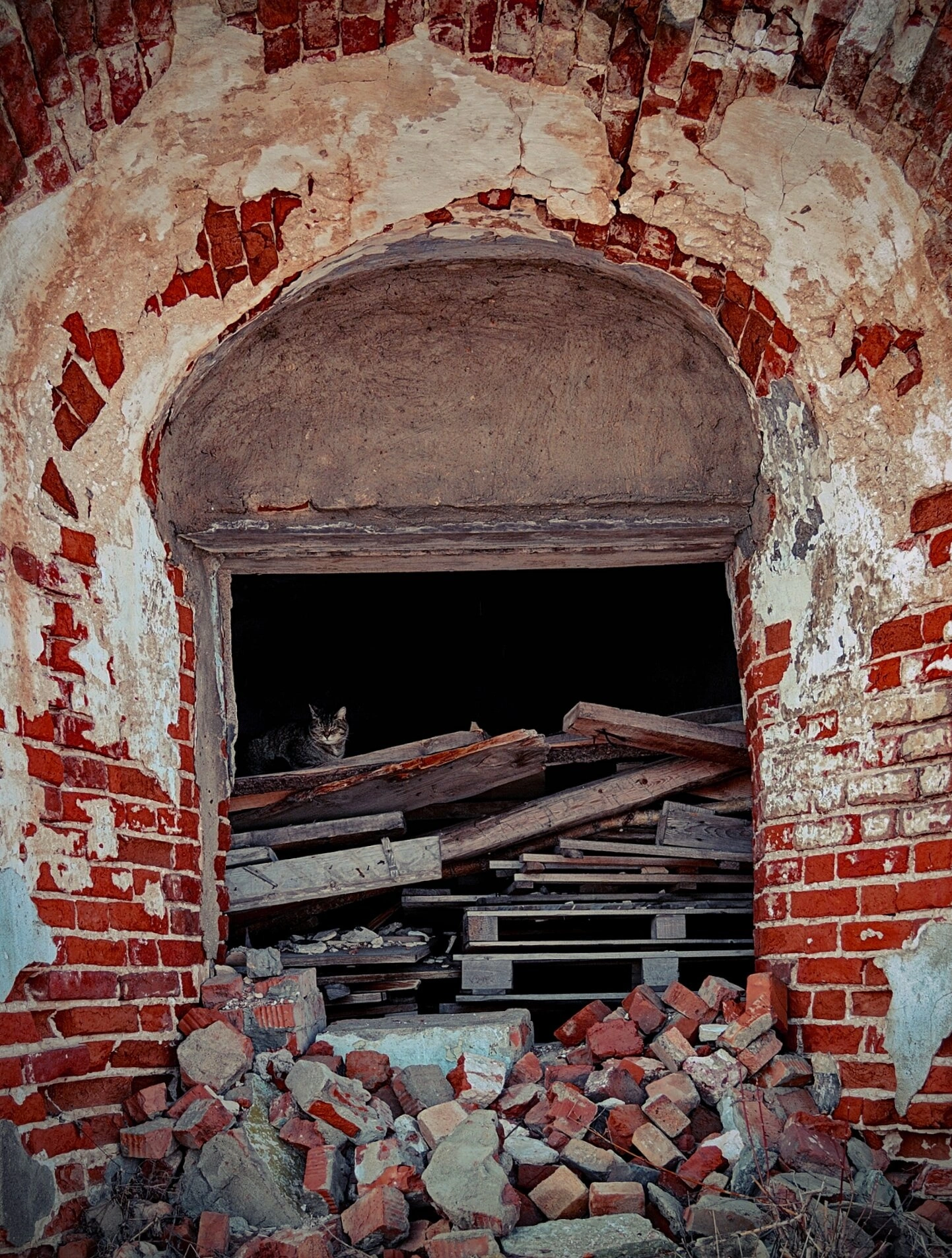 Особый смысловой акцент и символ надежды на возрождение вносит в композицию кошка, притаившаяся в тени арочного проема. В православной традиции животные также являются творением Божиим, и ее присутствие напоминает о том, что жизнь продолжается даже среди руин.