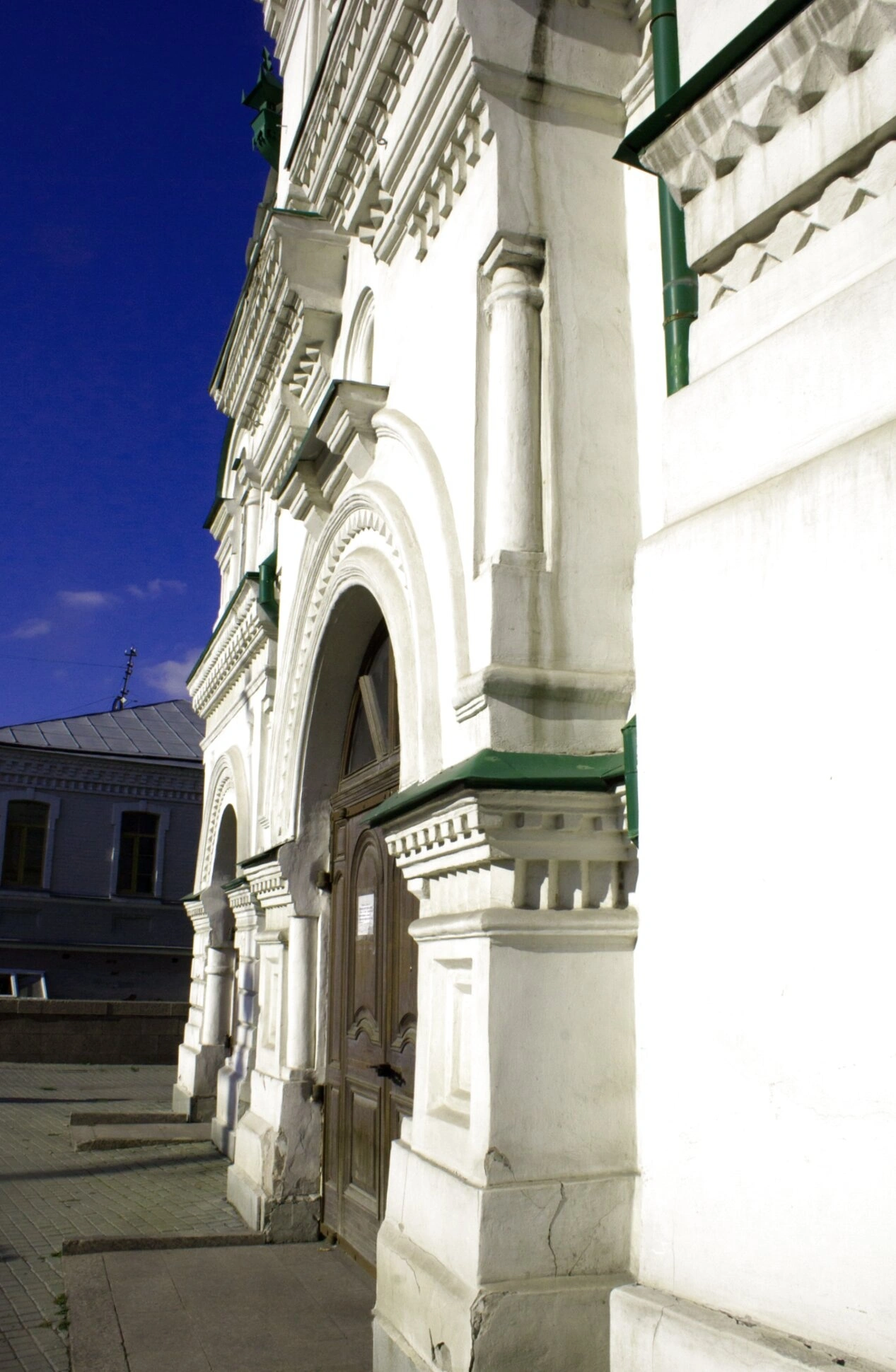 Изображение позволяет детально рассмотреть уникальное архитектурное убранство храма. Белоснежная стена, украшенная изящными пилястрами и сложным карнизом, прорезана арочными дверными проёмами, inviting верующих войти в дом Божий. Колонны, обрамляющие входы, богато декорированы лепниной, характерной для традиции сибирского барокко, что придаёт облику храма особую торжественность и величие.
