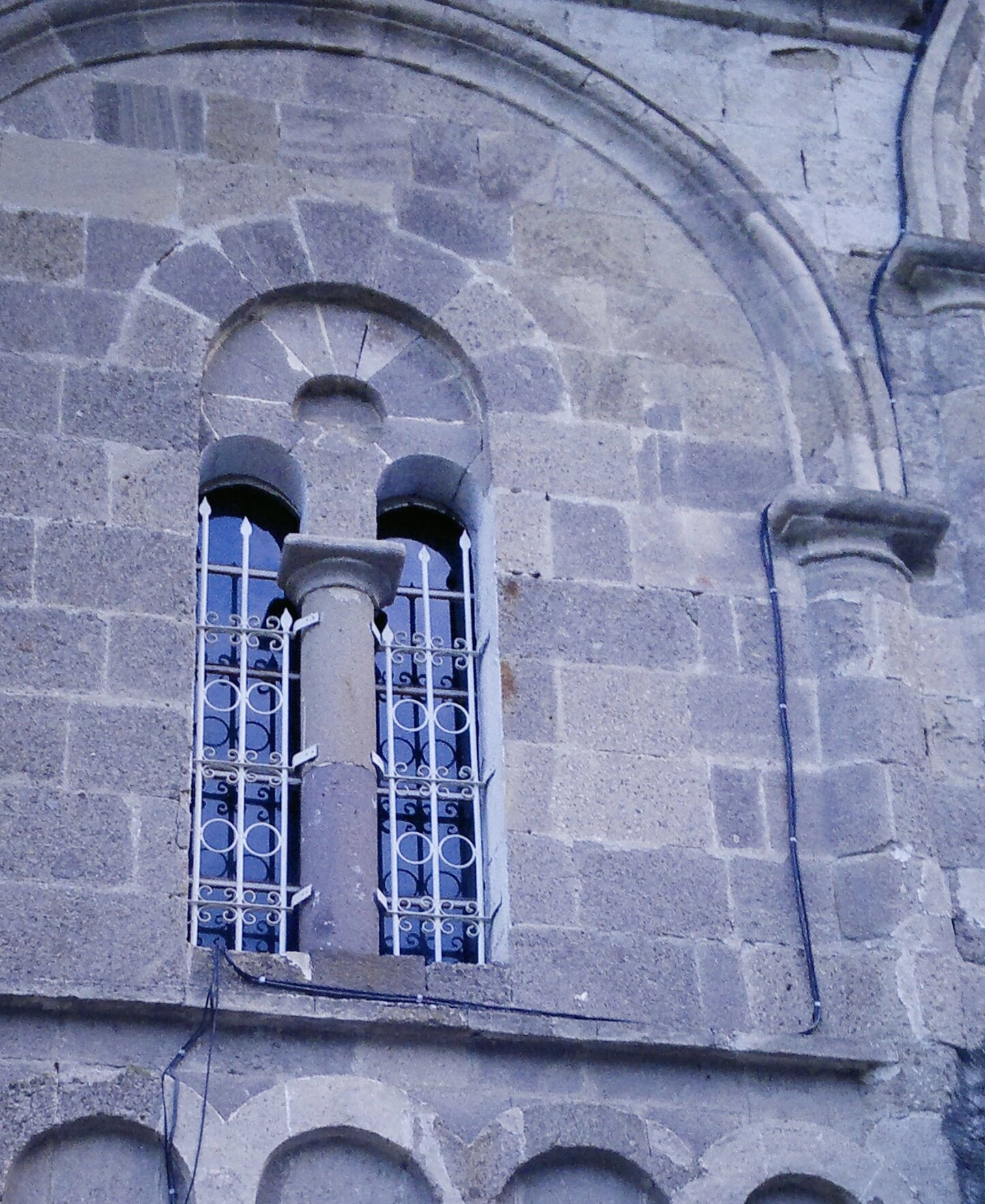 В центре композиции расположено арочное окно, характерный элемент храмовой архитектуры. Окно разделено на два проема массивной каменной колонной — импостом, что придает конструкции особую прочность и выразительность. Проемы украшены ажурной кованой решеткой, выполненной в традиционном стиле. Подобные решетки не только выполняют защитную функцию, но и символизируют ограждение духовного пространства храма от мира суетного.