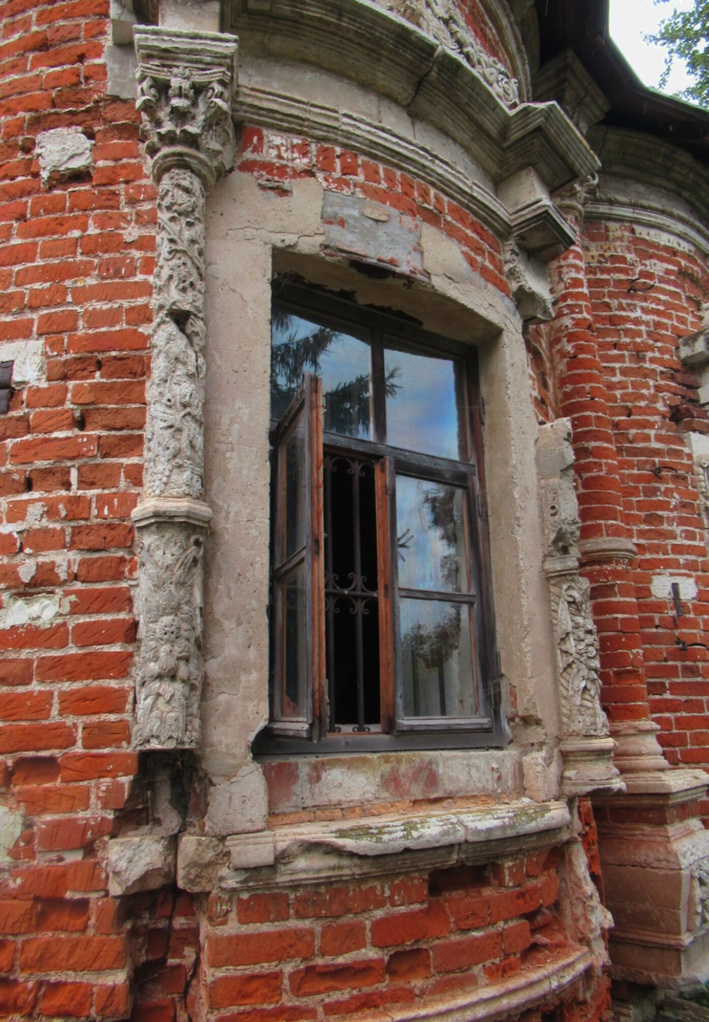 Окно с деревянной рамой и частично утраченными стёклами несёт на себе отпечаток времени, напоминая о долгой истории этого намоленного места. В отражениях в стекле угадываются небесная лазурь и кроны деревьев, символически связывая земное и небесное.