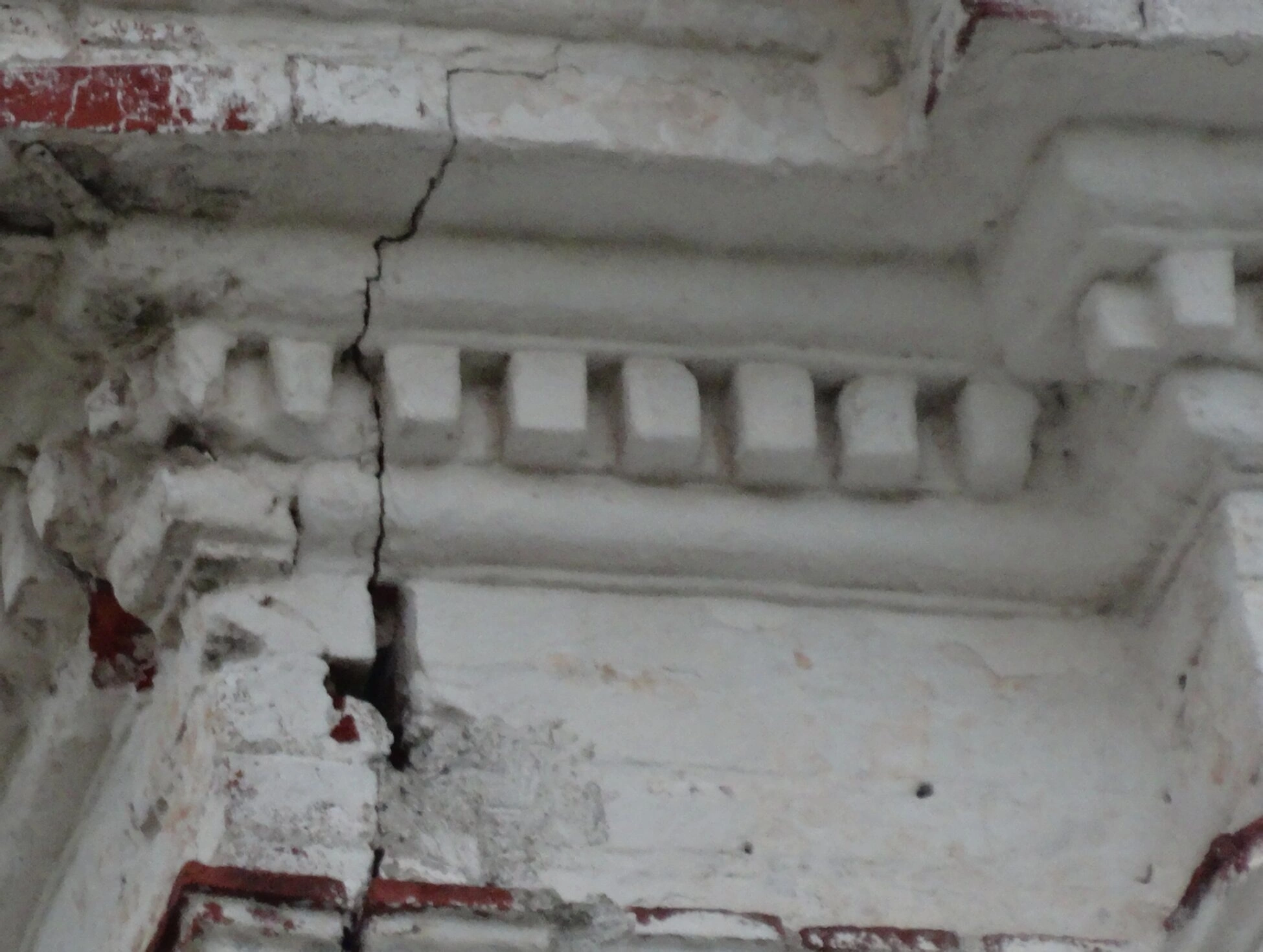 На снимке отчетливо видна часть карниза, украшенная декоративными элементами, характерными для периода московского барокко. Примечательны детали, напоминающие сухарики или дентикулы, которые создают сложную игру света и тени, подчеркивая вертикальную устремленность сооружения. Штукатурный слой и краска, к сожалению, имеют значительные повреждения: видны многочисленные трещины и участки с облупившимся покрытием, что свидетельствует о длительном времени neglect и необходимости проведения срочных реставрационных работ.
