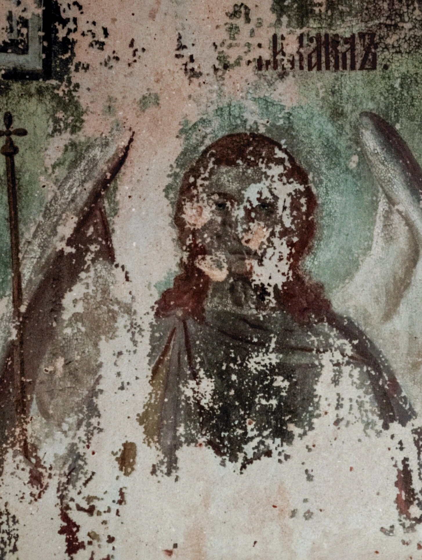 По обе стороны от фигуры видны фрагменты крыльев, что позволяет предположить изображение ангельского чина. Правый фрагмент крыла сохранился несколько лучше, демонстрируя первоначальные очертания. В левой части композиции различим тонкий длинный предмет, напоминающий посох или крест - традиционный атрибут святых в православной иконографии.