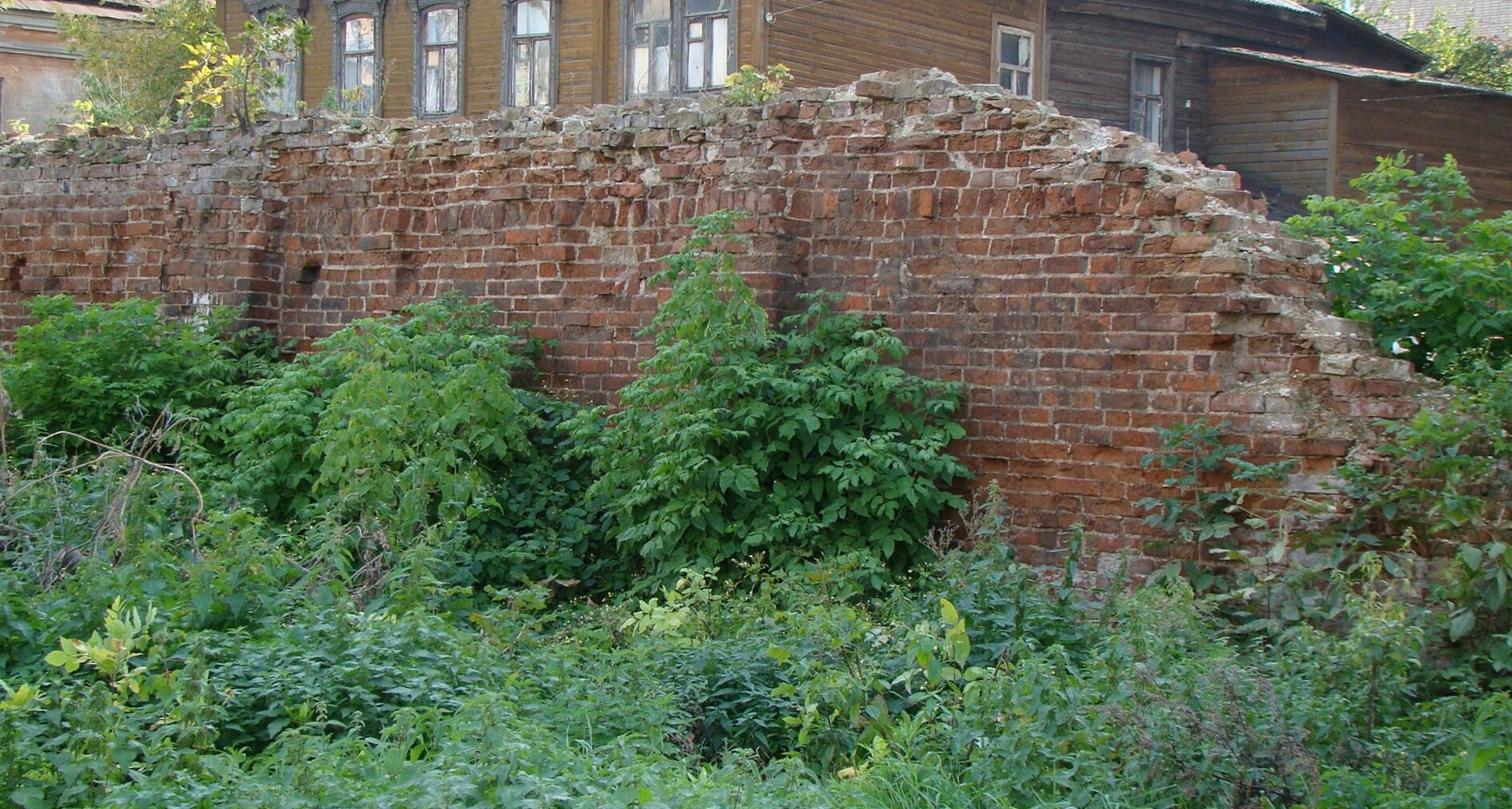 На снимке явственно видны следы разрушительного действия времени: кладка частично обрушена, кирпич выкрошился. Монастырская стена, некогда ограждавшая молитвенный покой инокинь от суетного мира, ныне сама нуждается в защите и сохранении как памятник церковной старины. Природа постепенно вбирает в себя творение рук человеческих: основание стены и пространство перед ней обильно поросли кустарниковой растительностью, среди которой угадываются бузина и дикая малина.