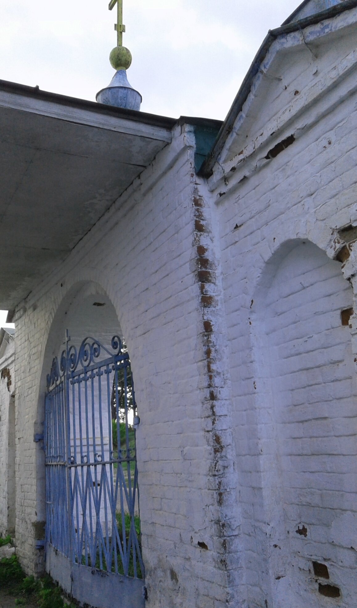 Над воротами взмывает в небо изящный купол, увенчанный православным крестом, который символизирует искупительную жертву Господа нашего Иисуса Христа. Фотография передаёт благородную патину времени, проступившую сквозь облупившуюся штукатурку и обнажившую древнюю кирпичную кладку. Это зримое свидетельство истории и непреходящей веры, которую хранили в стенах этой обители многие поколения православных христиан.