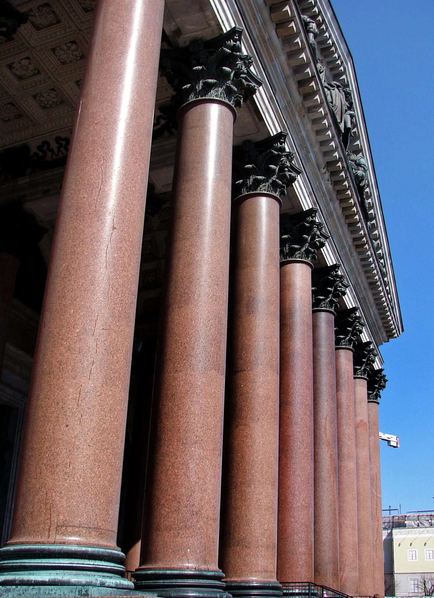 В центре композиции — монолитные колонны из тёмно-красного гранита, каждая высотой в семнадцать метров и весом сто четырнадцать тонн . Эти исполинские столпы, на которых покоится тяжесть портика, были вырублены в каменоломнях близ Выборга и установлены с применением новаторских для своего времени инженерных решений . Поверхность камня хранит вековую память: благородная фактура, природные прожилки и следы времени, включая отметины от осколков времён испытаний, говорят о непоколебимой стойности святыни .